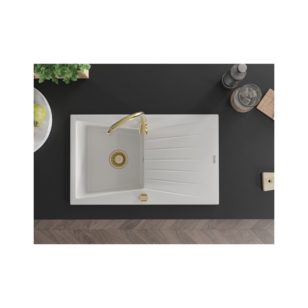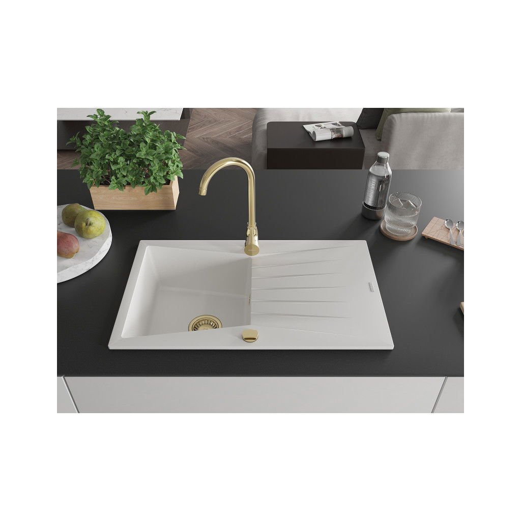 Mexen Cesar, chiuveta granit 1 camera cu scurgere 78x47 cm si baterie de bucatarie Telma, alb, 6514-20-670200-50