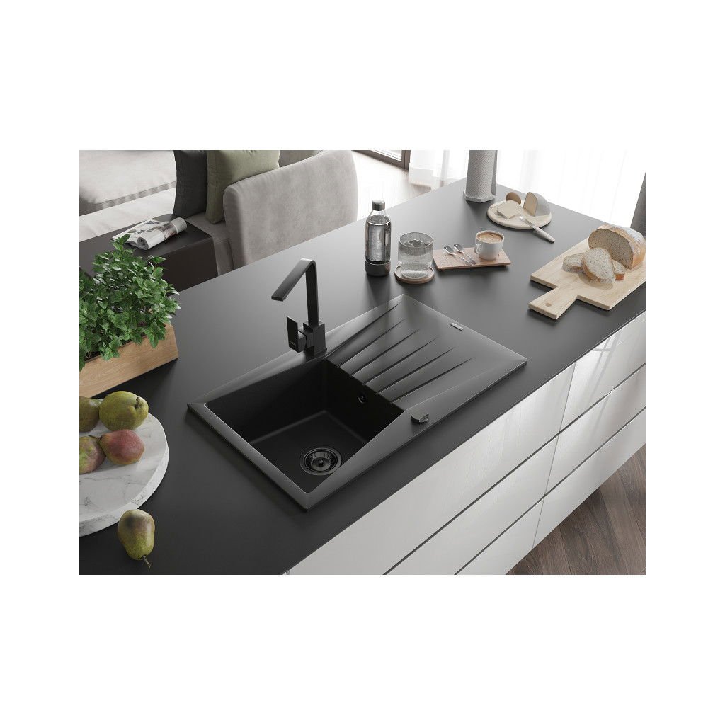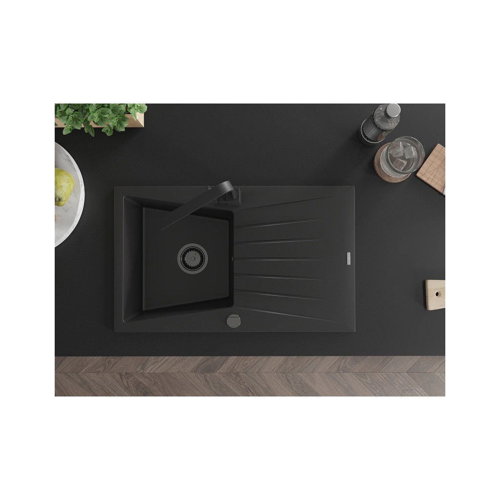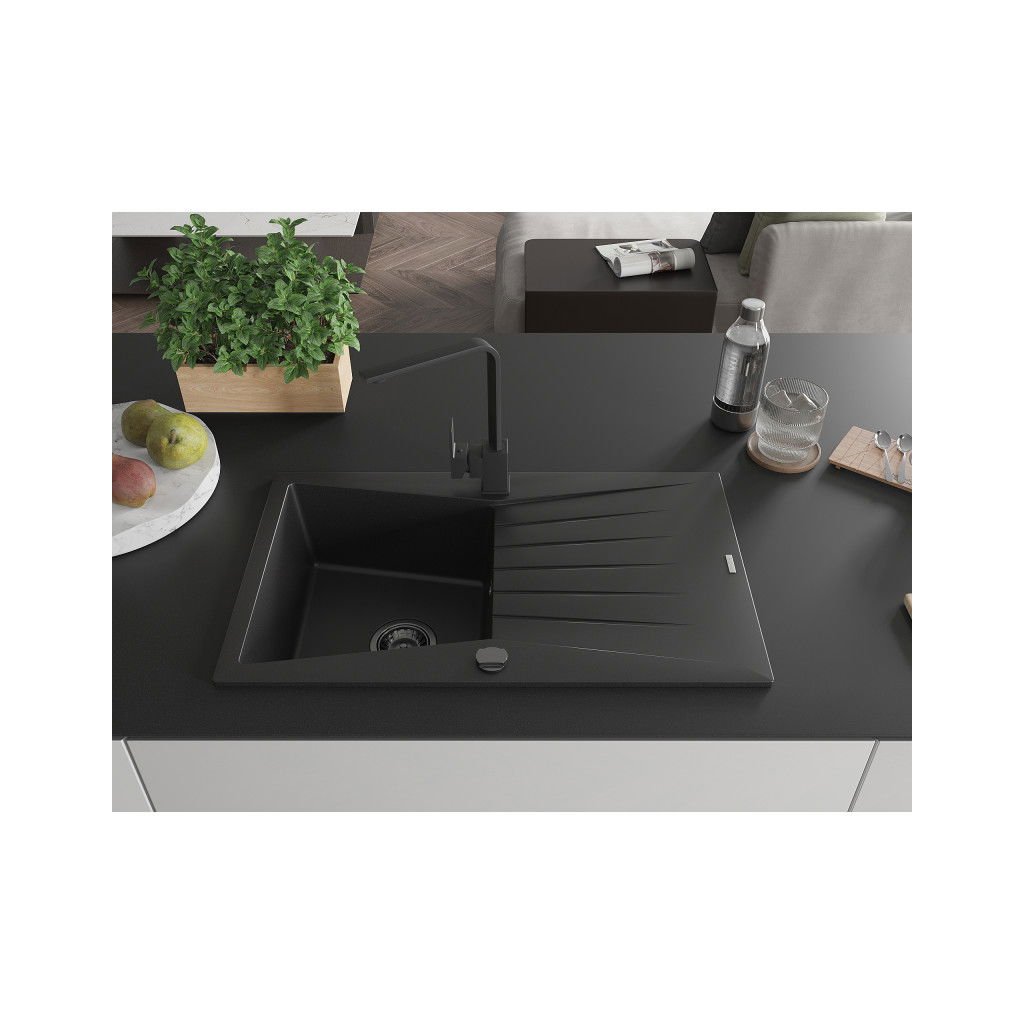 Mexen Cesar, chiuveta granit 775x470x190 mm, 1 camera, negru cu sifon negru si robinet chiuveta Rita neagra, 6514-77-670300-70-B