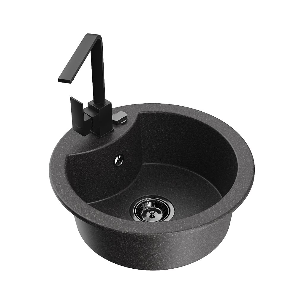Mexen Diego, chiuvetă granit cu 1 compartiment 488x488x167 mm, sifon negru, robinet negru mat Rita, pete negre, 6512-76-670300-70-B