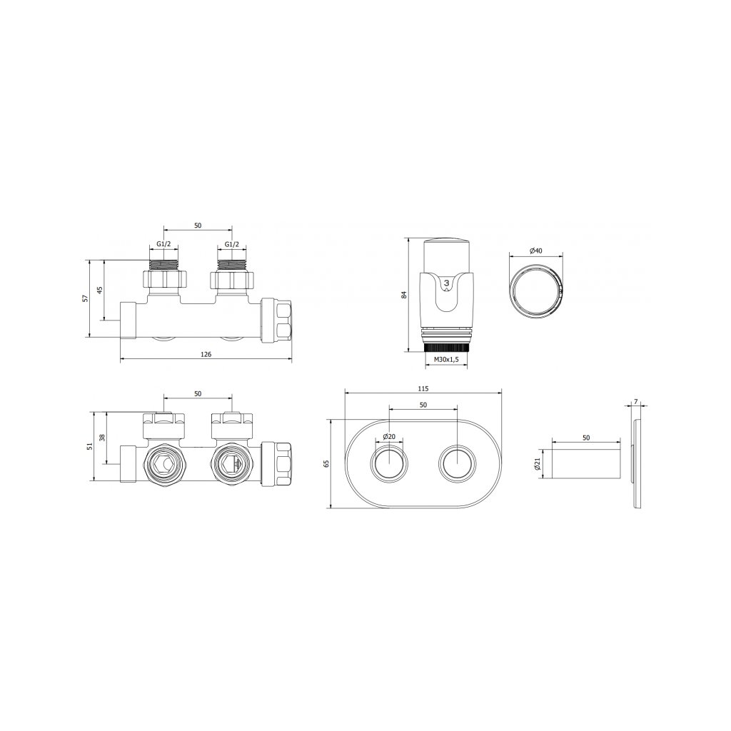 Mexen G00, set racord supapă termostatică pentru racord central DN50 + capac, alb, W907-900-905-20