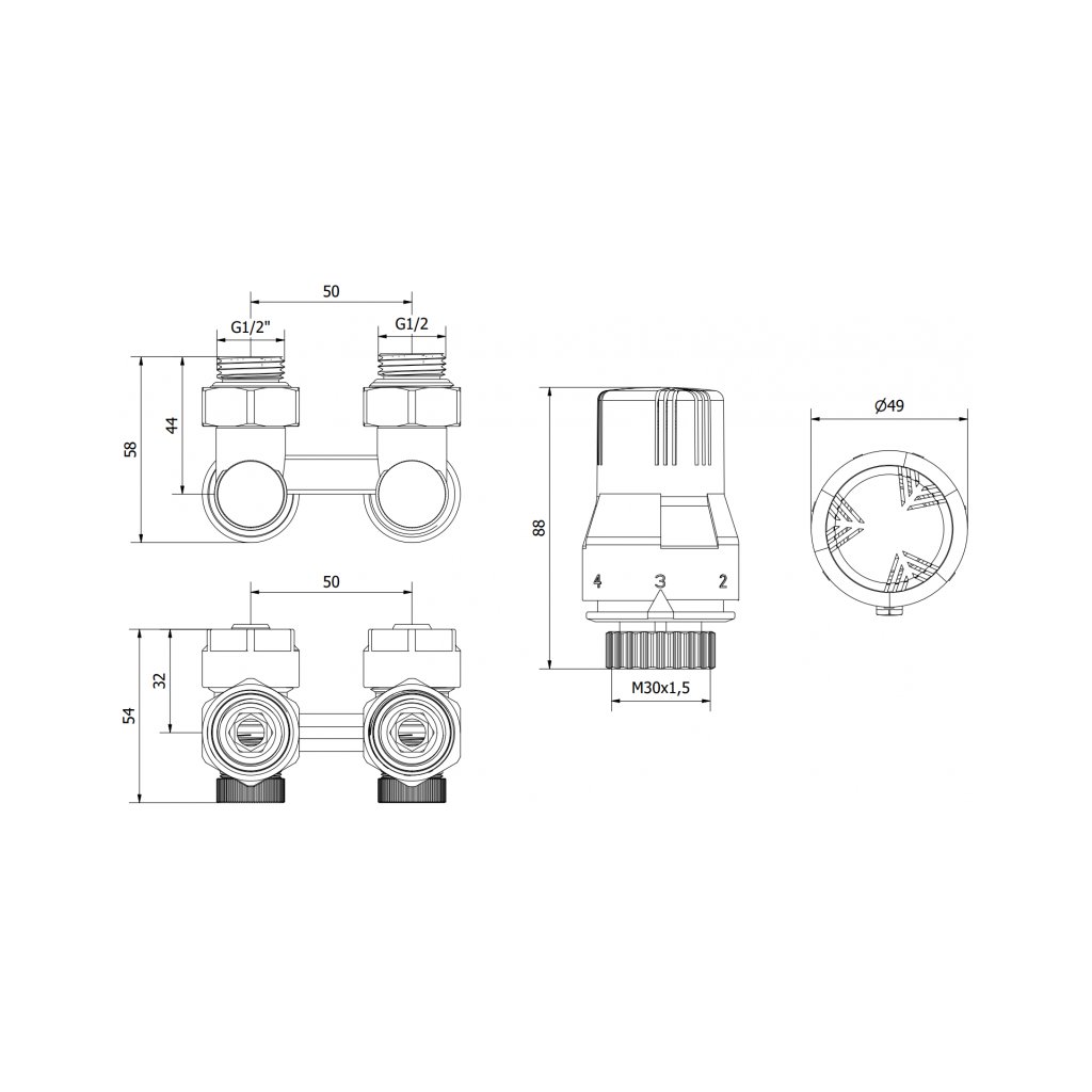 Mexen G02, set termostatic unghi DN50, unghi 1/2"x16 mm cu cap termostatic M30x1,5 mm, otel, W911-016-928-01