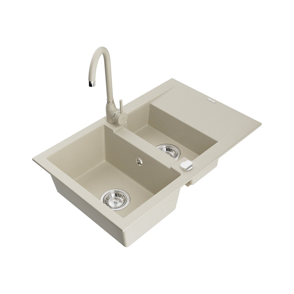Mexen Gaspar, chiuveta granit 1,5 camere cu scurgere 74x48 cm si baterie bucatarie Telma, bej, 6507-69-670200-69