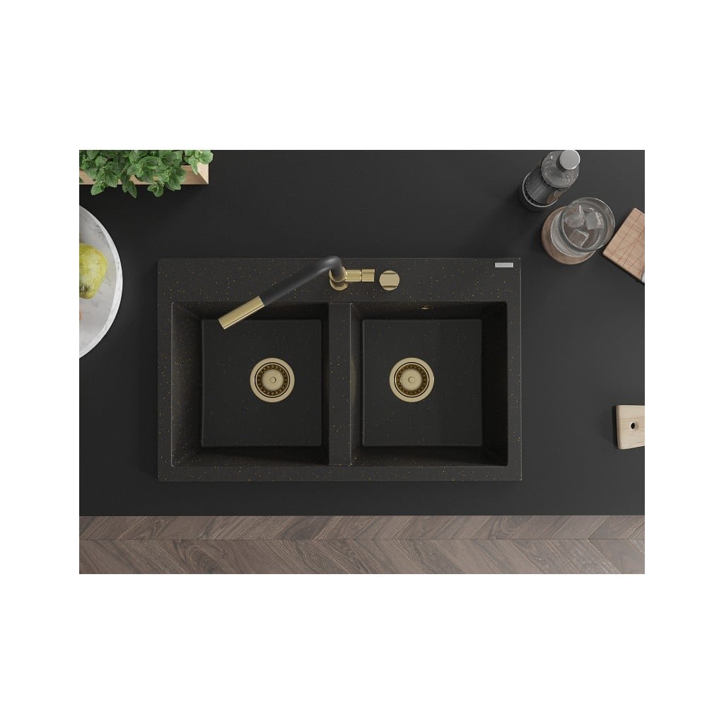 Mexen Hektor, chiuvetă granit cu 2 camere 800x480x205 mm, negru-auriu metalic, sifon auriu, 6521802000-75-G
