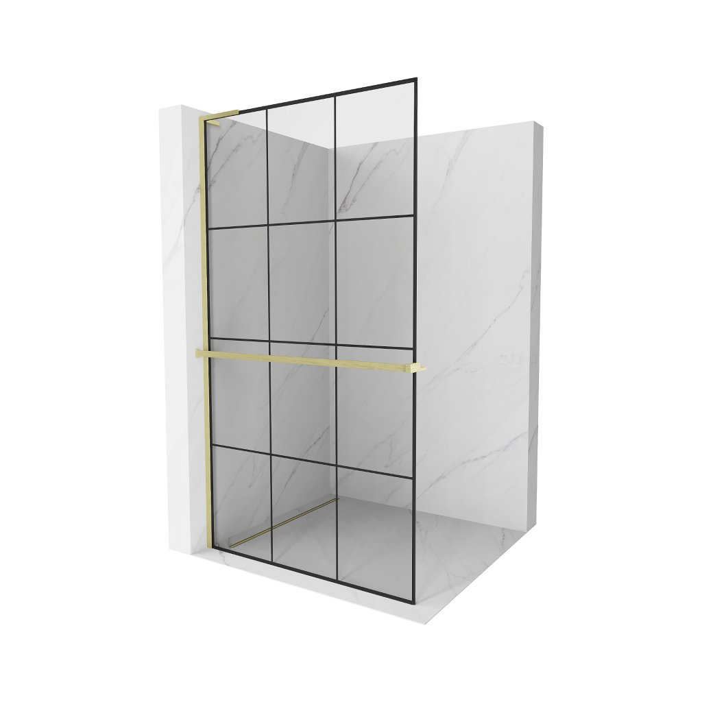 Mexen Kioto+ L, paravan de dus walk-in cu polita si cuier 100 x 200 cm, sticla transparenta 8 mm model negru, profil auriu mat, 800-100-123-55-77
