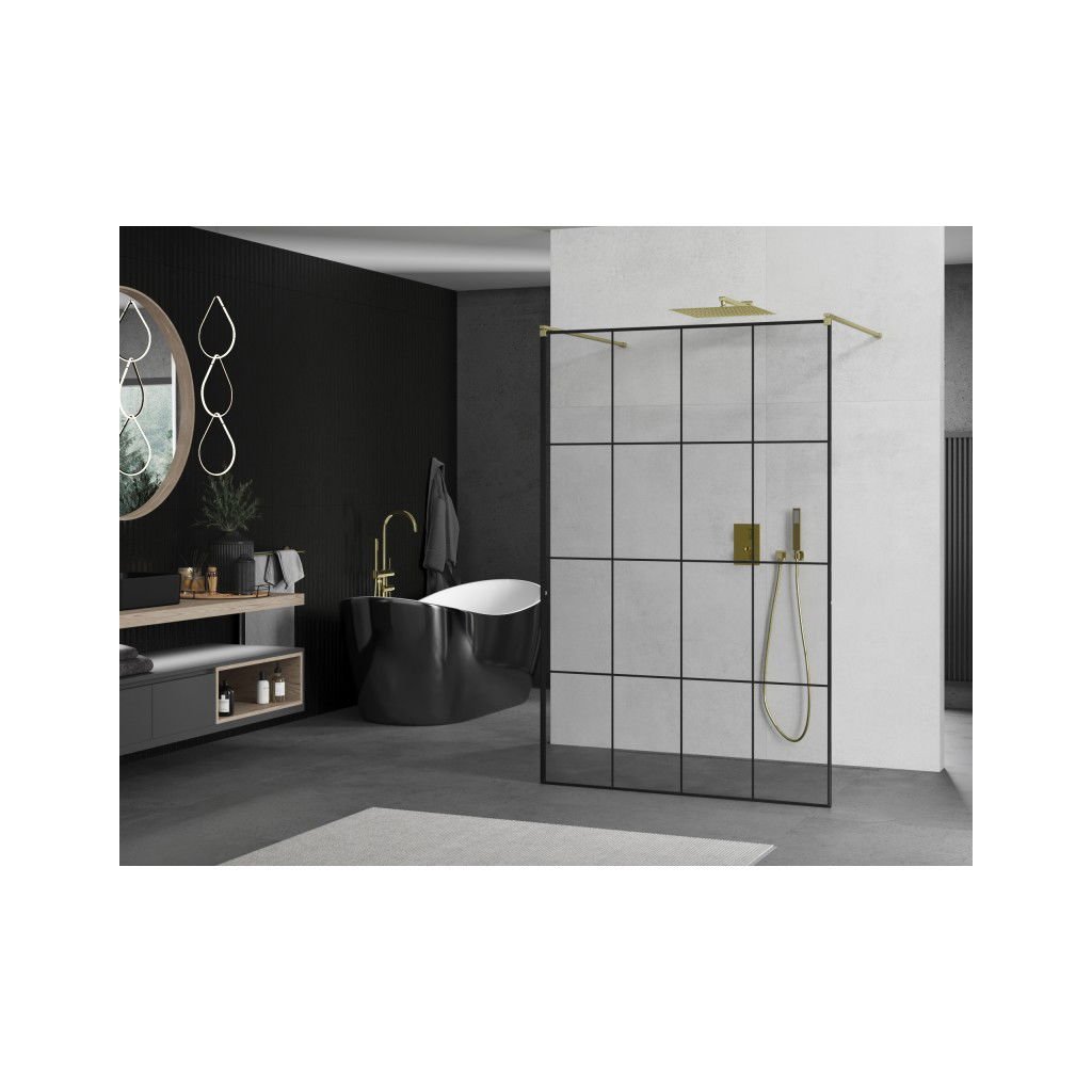 Mexen Kioto, Masa de dus Walk-In 150 x 200 cm, model sticla neagra 8 mm, profil auriu mat, 800-150-002-55-77