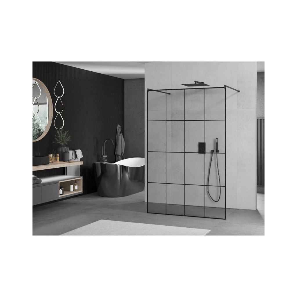 Mexen Kioto, paravan de duș 130 x 200 cm, 8 mm sticlă transparentă/model negru, 2x distanțier stabilizator negru, 800-130-002-70-77