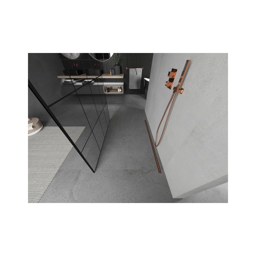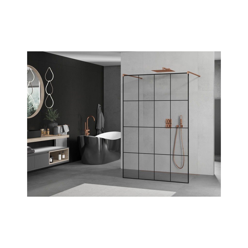 Mexen Kioto, paravan de duș 140 x 200 cm, sticlă transparentă de 8 mm - model negru, 2x distanțier stabilizator auriu, profil auriu roz, 800-140-002-60-77