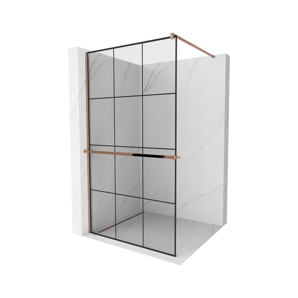 Mexen Kioto, paravan de dus cu polita si suport pentru prosoape 120 x 200 cm, sticla transparenta 8 mm cu model negru, profil auriu roz, 800-120-121-60-77