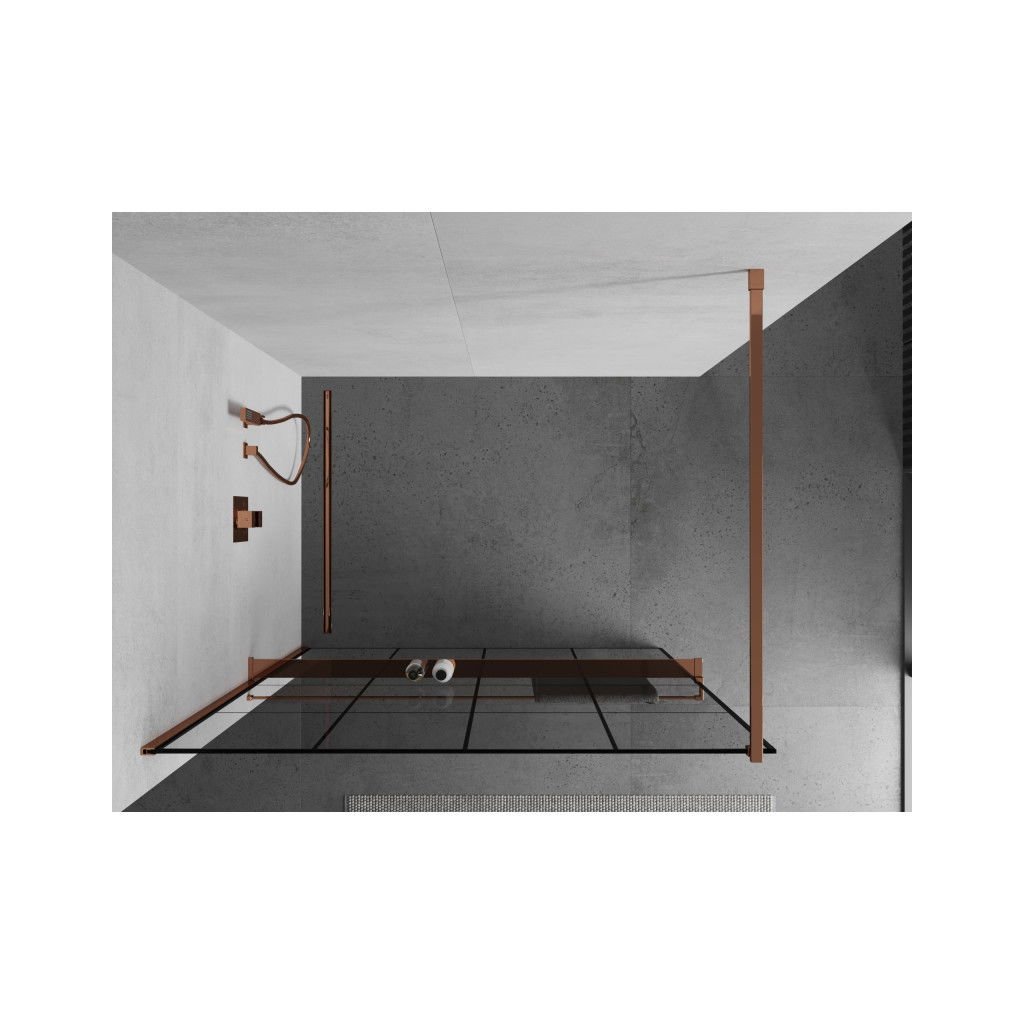 Mexen Kioto, paravan de dus cu polita si suport pentru prosoape 130 x 200 cm, sticla transparenta 8 mm cu model negru, profil auriu roz, 800-130-121-60-77