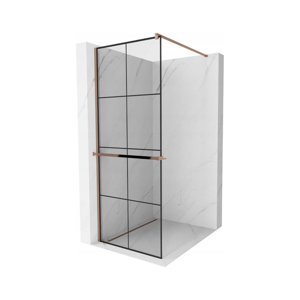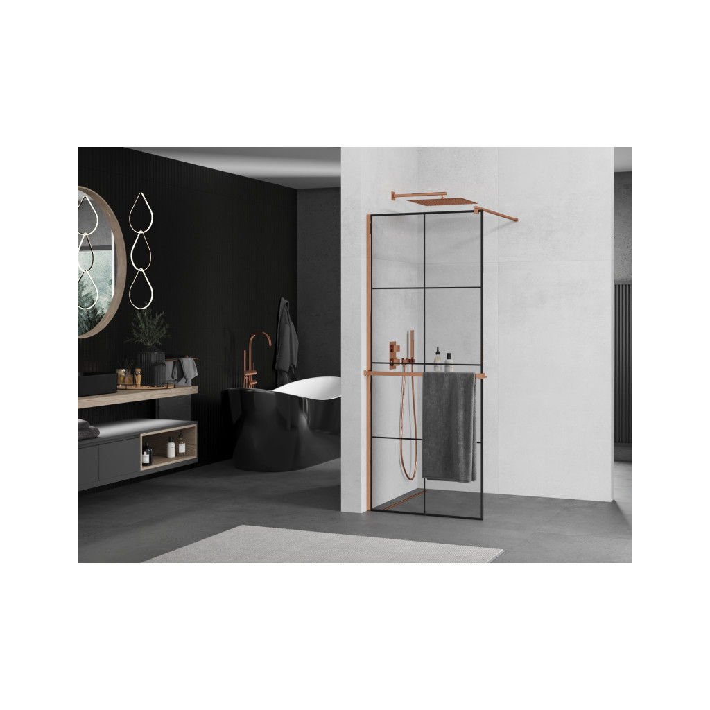 Mexen Kioto, paravan de duș cu poliță și suport pentru prosoape 90 x 200 cm, sticlă transparentă de 8 mm cu model negru, profil auriu roz, 800-090-121-60-77