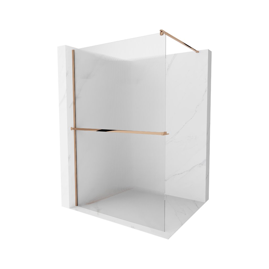 Mexen Kioto, paravan de dus cu raft si suport pentru prosoape 140 x 200 cm, sticla 8 mm cu model nervurat, profil auriu roz, 800-140-121-60-09