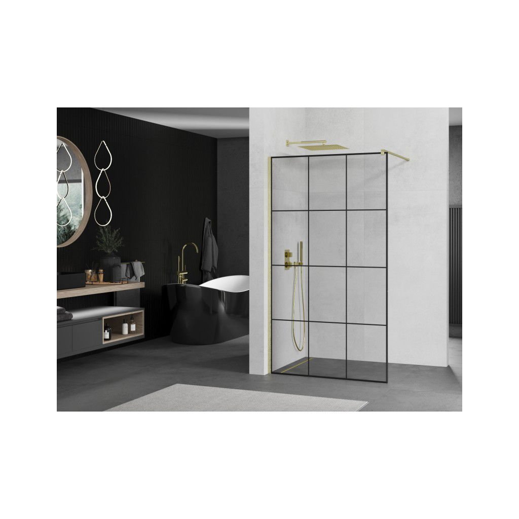 Mexen Kioto, paravan de dus walk-in 110 x 200 cm, 8 mm sticla transparenta model negru, profil auriu mat, 800-110-101-55-77