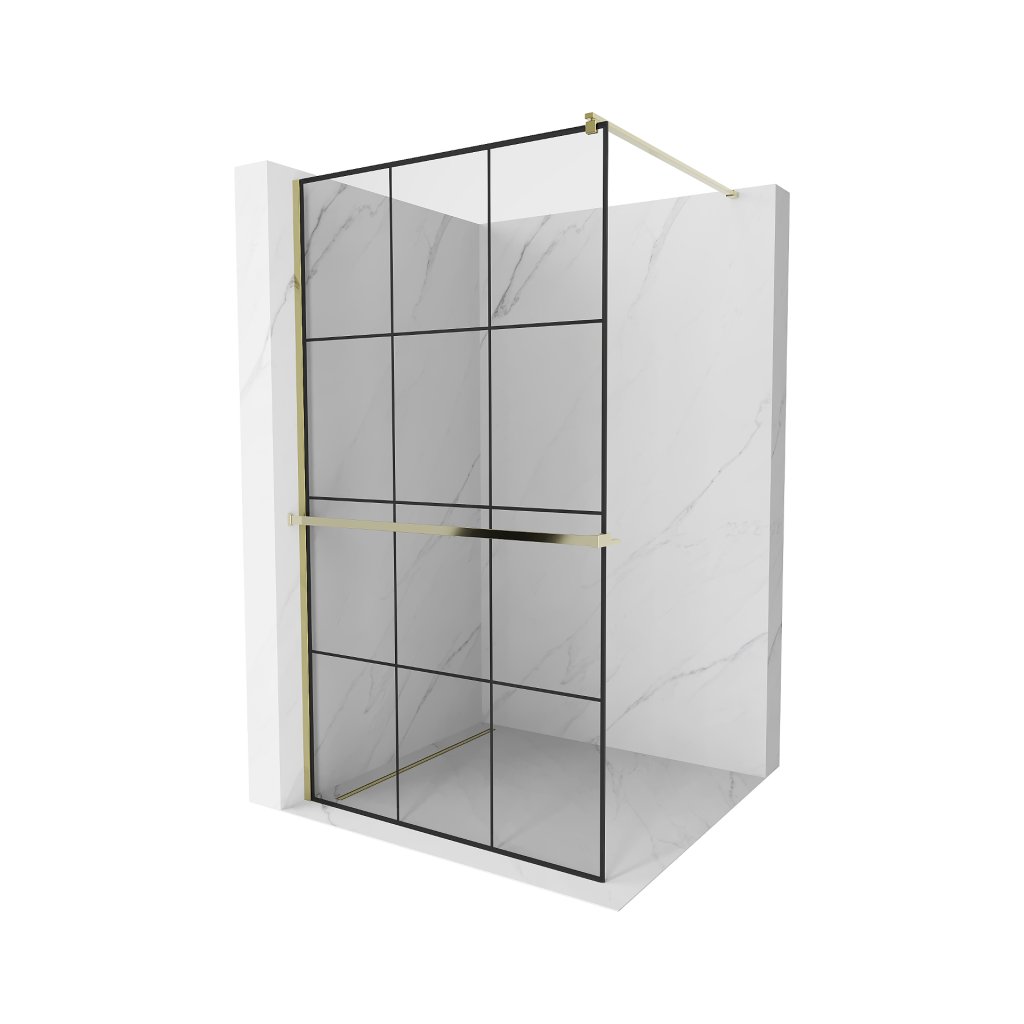 Mexen Kioto+, paravan de dus cu polita si suport pentru prosoape 110 x 200 cm, sticla transparenta 8 mm model negru, profil auriu, 800-110-121-50-77