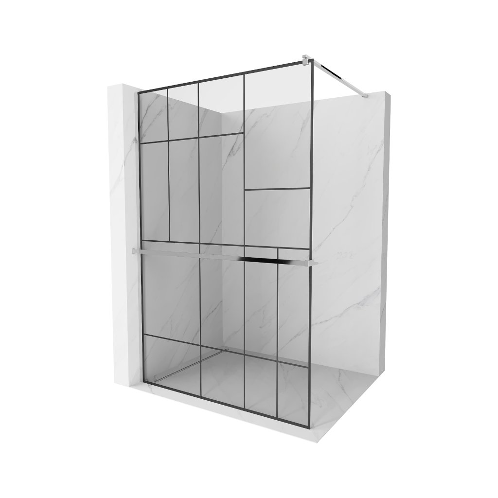 Mexen Kioto+, paravan de dus cu polita si suport pentru prosoape 110 x 200 cm, sticla transparenta 8 mm model negru, profil cromat, 800-110-121-01-78