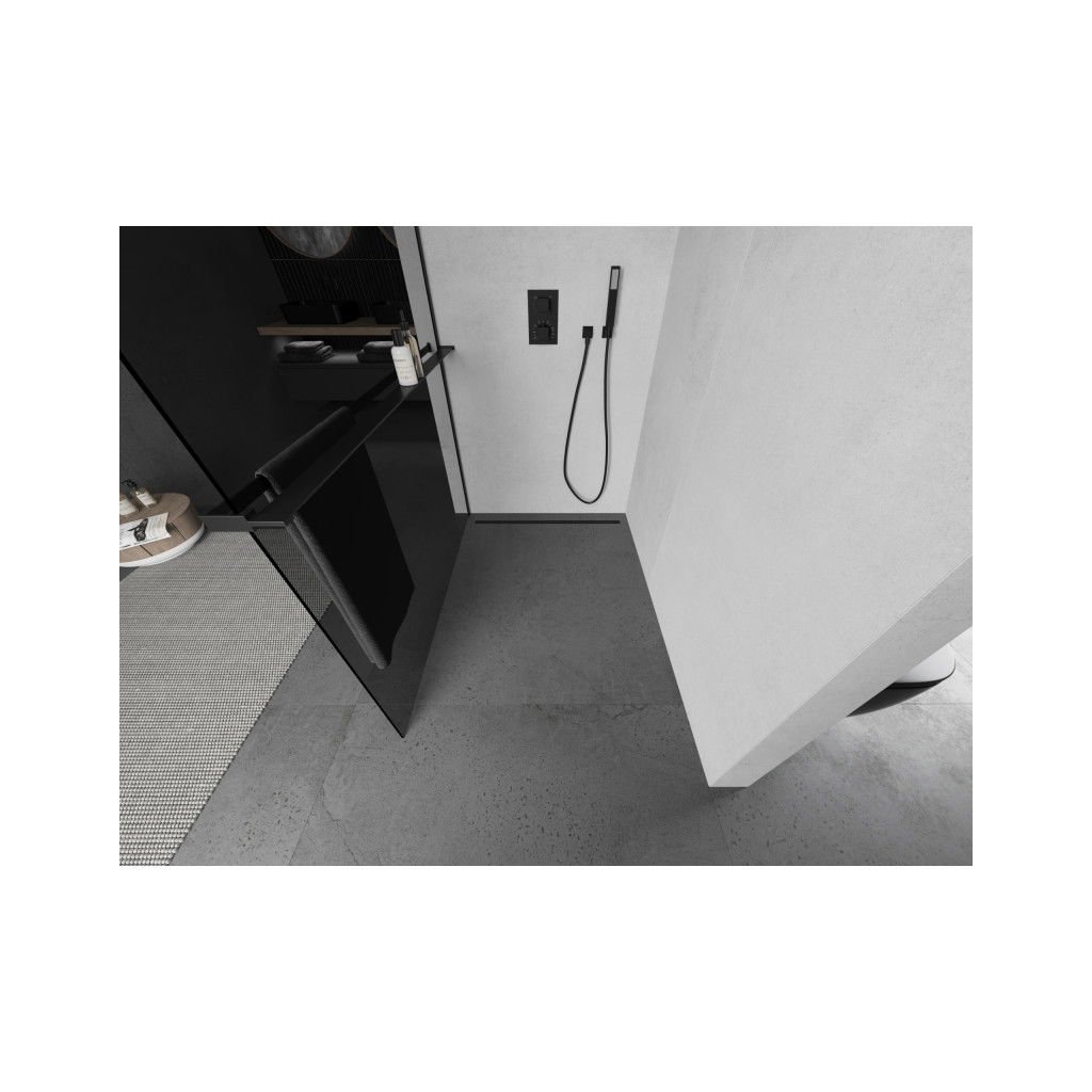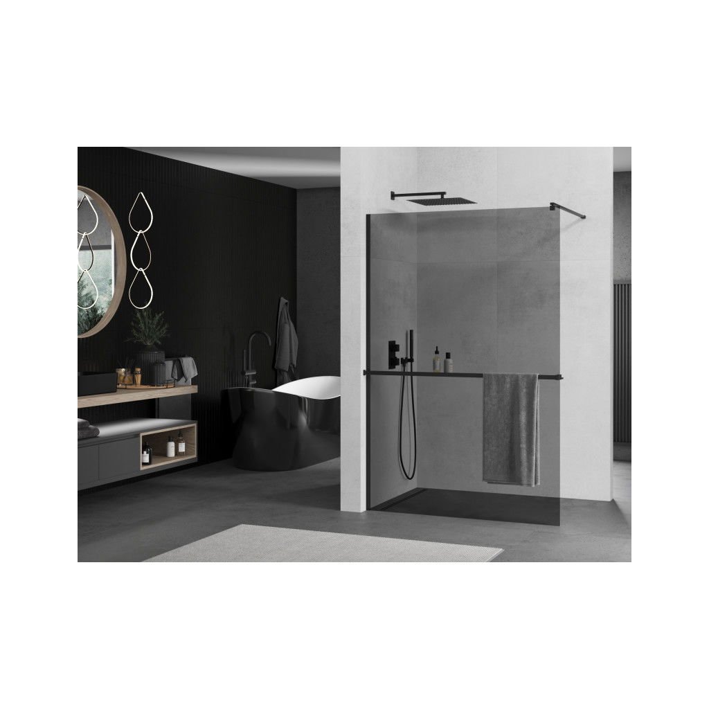 Mexen Kioto+, paravan de dus cu polita si suport pentru prosoape 120 x 200 cm, sticla gri 8mm, profil negru, 800-120-121-70-40