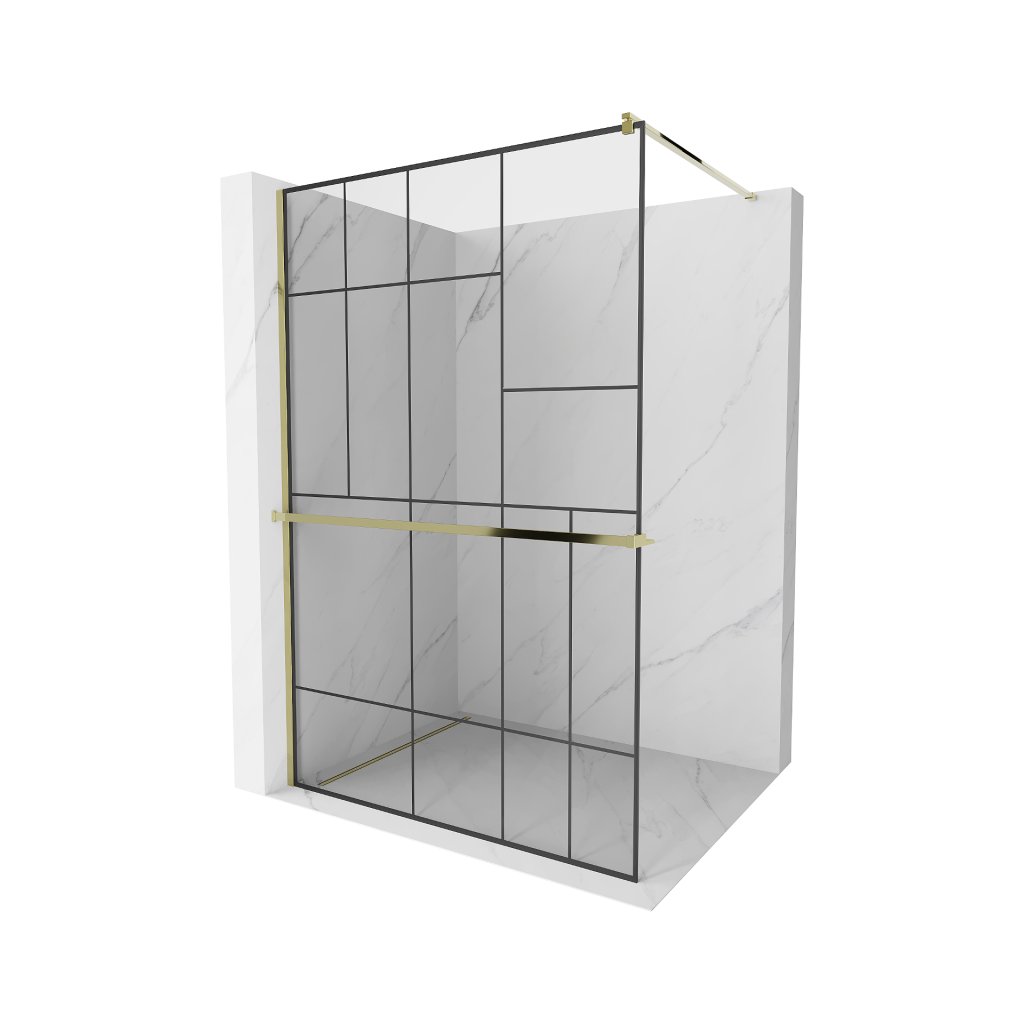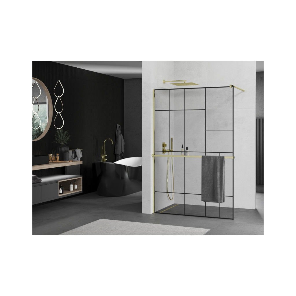 Mexen Kioto+, paravan de dus cu polita si suport pentru prosoape 140 x 200 cm, sticla transparenta 8 mm model negru, profil auriu, 800-140-121-50-78