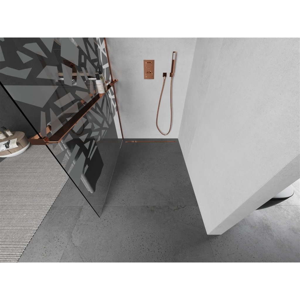 Mexen Kioto+, paravan de duș cu poliță și suport pentru prosoape 140 x 200 cm, sticlă transparentă model alb de 8 mm, profil auriu roz, 800-140-121-60-85