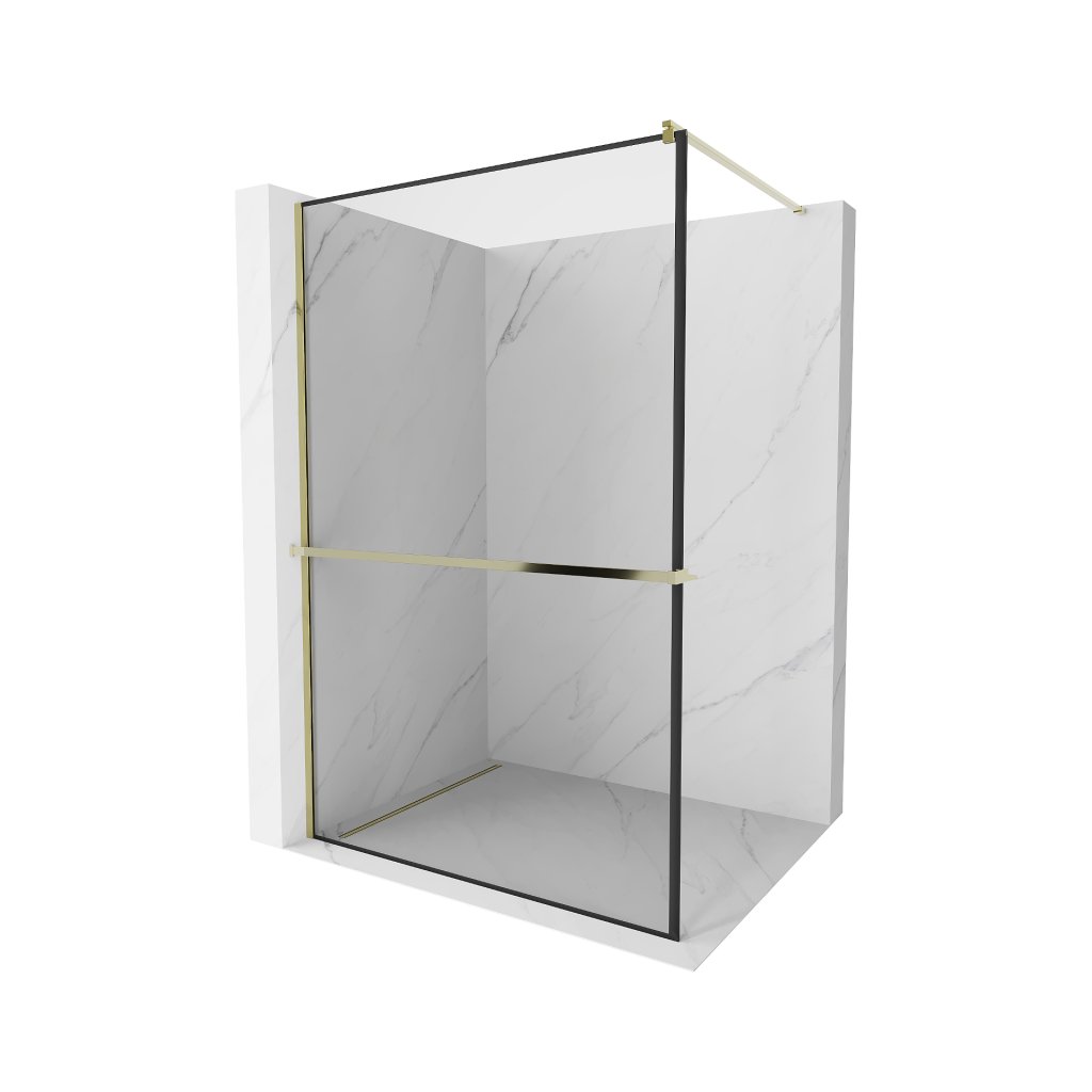 Mexen Kioto+, paravan de duș cu poliță și suport pentru prosoape 90 x 200 cm, cadru negru model sticlă transparentă de 8 mm, profil auriu, 800-090-121-50-70