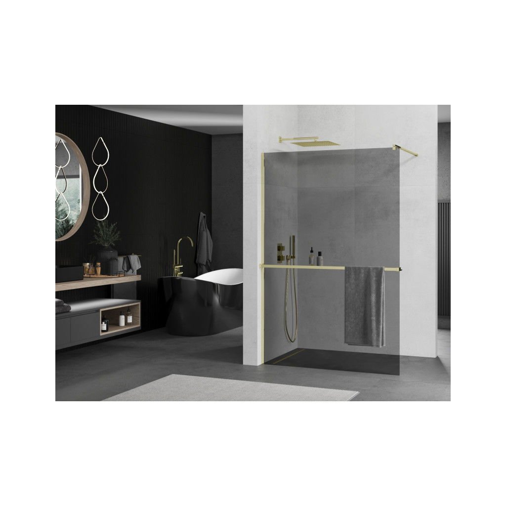 Mexen Kioto+, paravan de dus cu polita si suport pentru prosoape 90 x 200 cm, sticla gri 8mm, profil auriu, 800-090-121-50-40