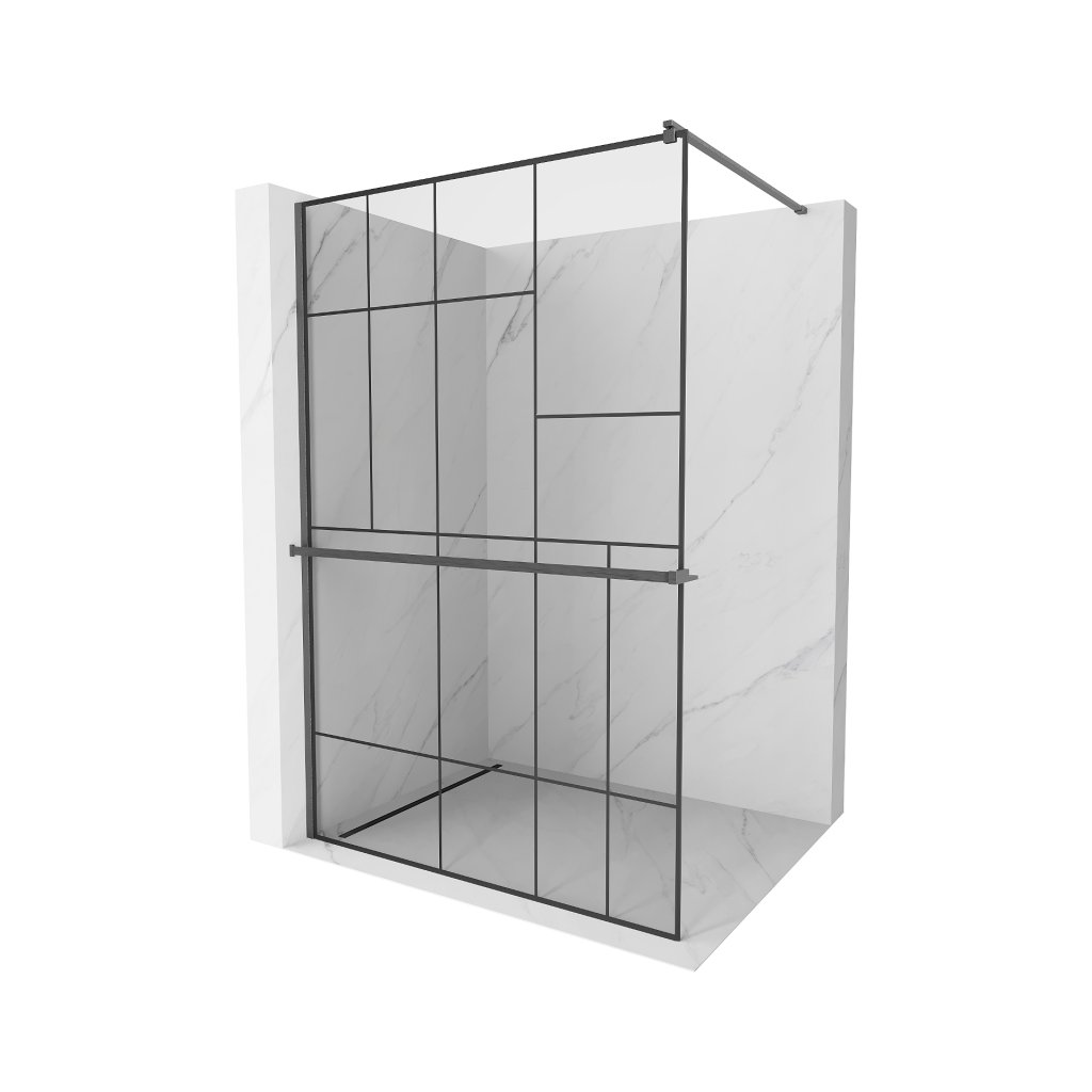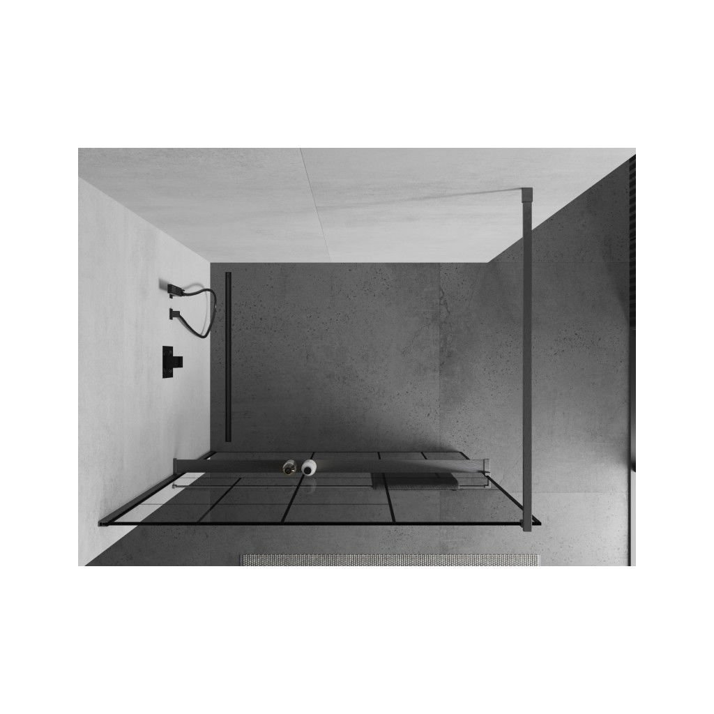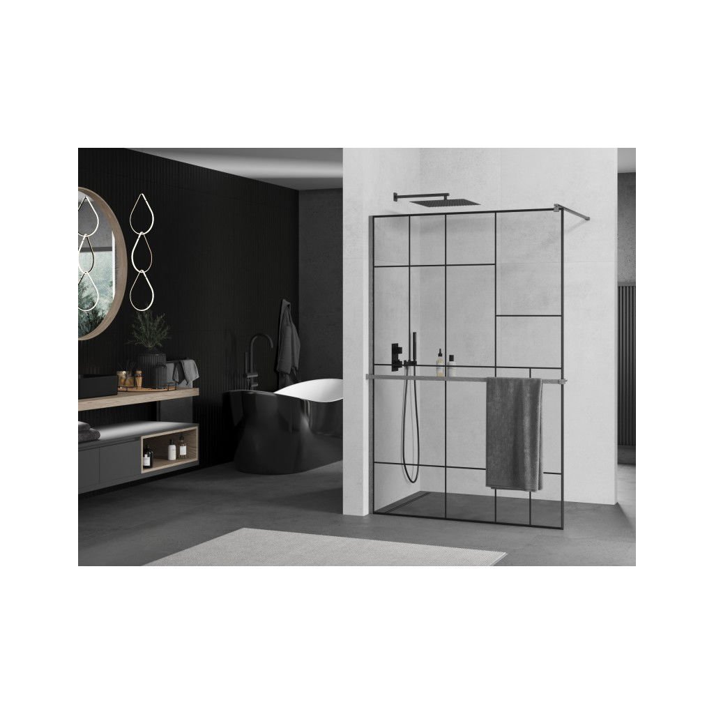 Mexen Kioto+, paravan de dus walk-in cu polita si cuier 140 x 200 cm, sticla transparenta 8 mm model negru, profil grafit, 800-140-121-66-78