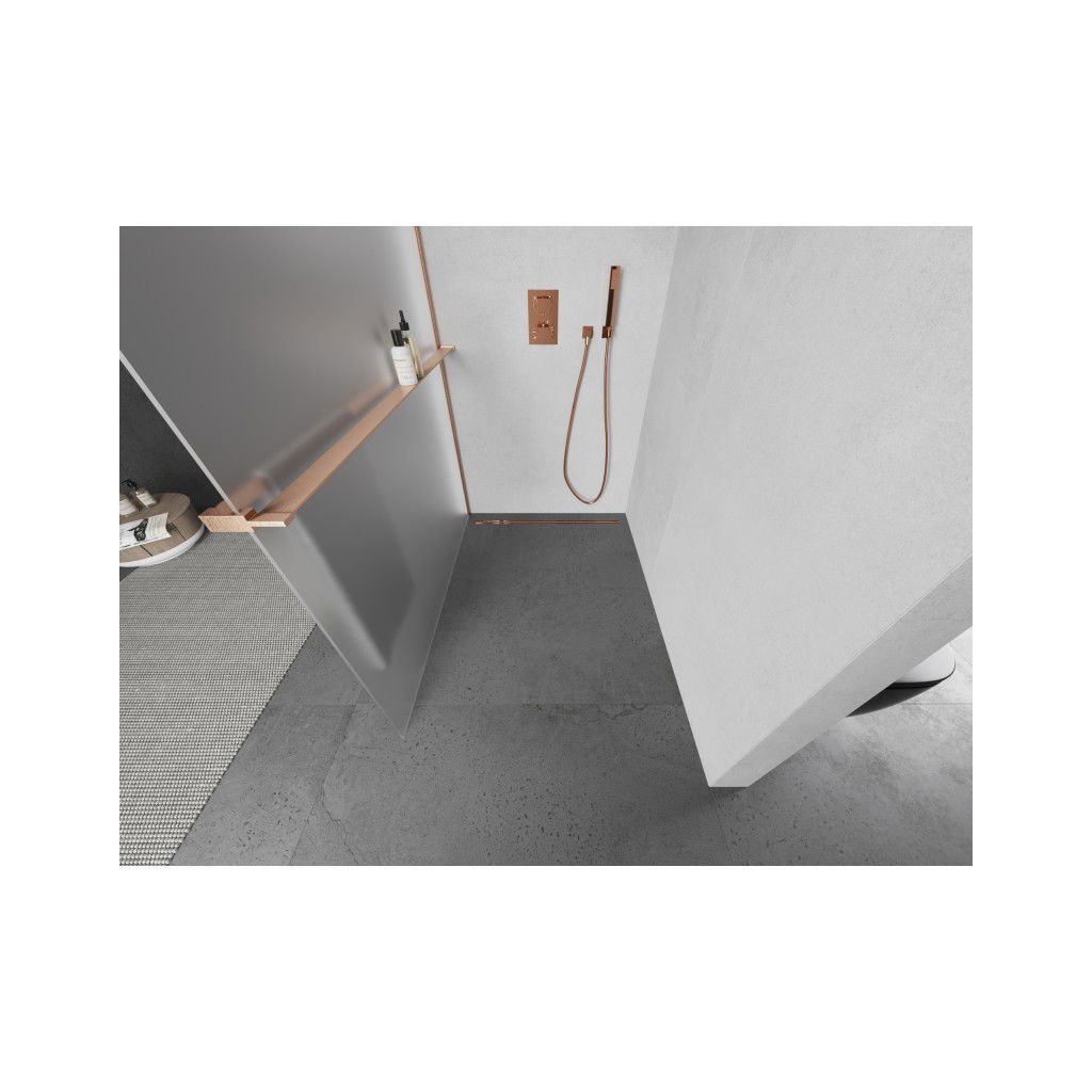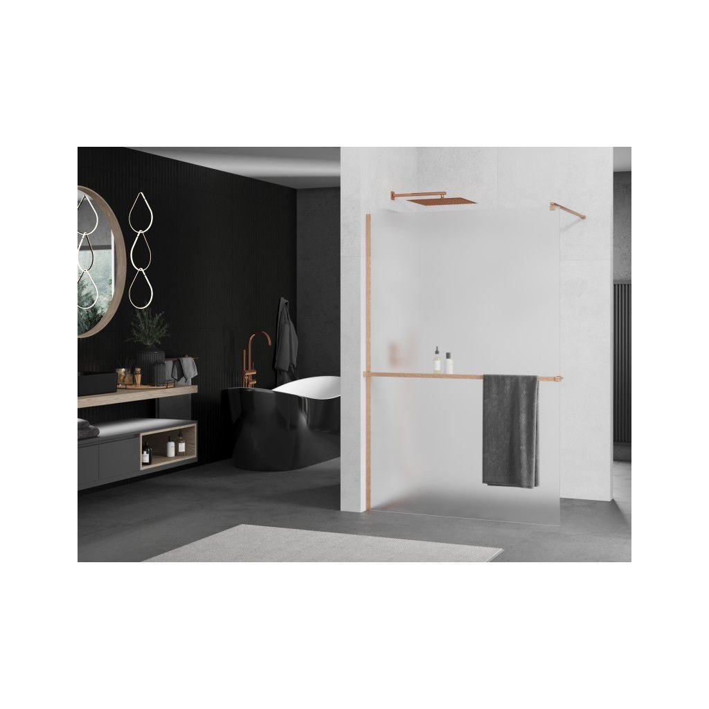 Mexen Kioto+, paravan de dus walk-in cu raft si cuier 140 x 200 cm, sticla mata 8 mm, profil cupru mat, 800-140-121-65-30