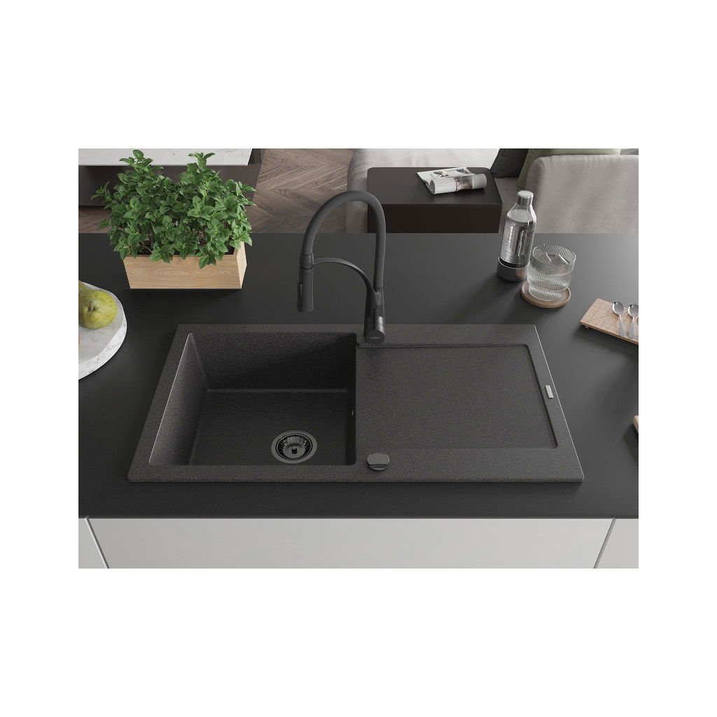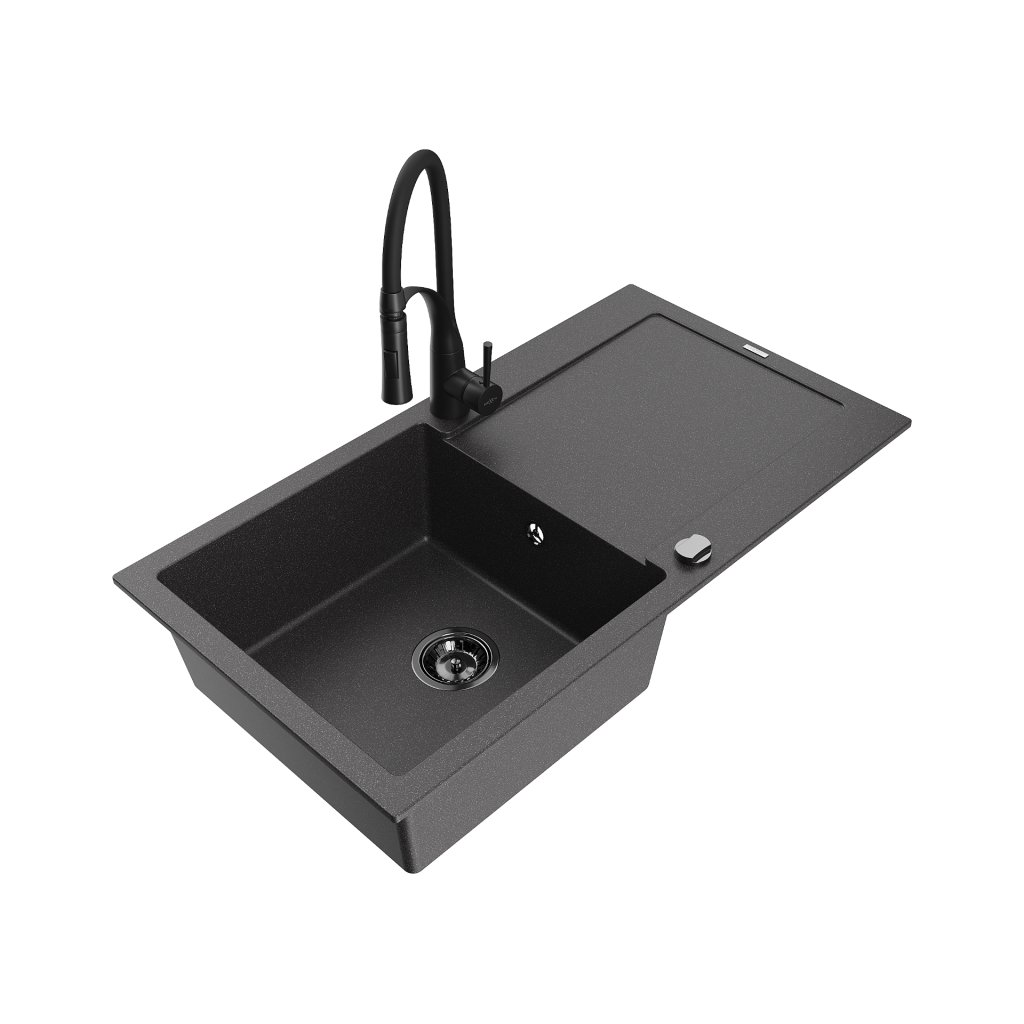 Mexen Leo, chiuveta granit 900x500x190 mm, robinet chiuveta cu 1 camera si Aster, pete negre, 6501-76-73450-70-B