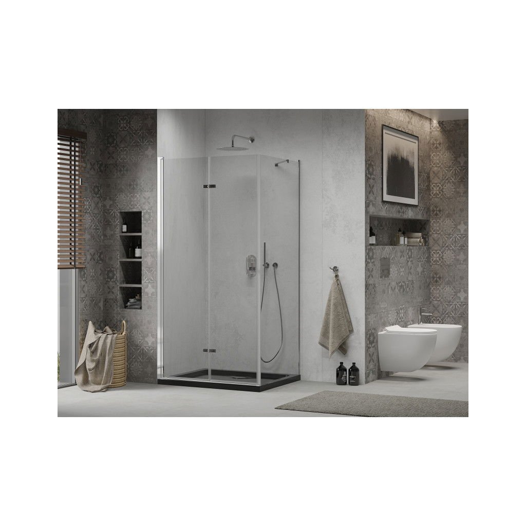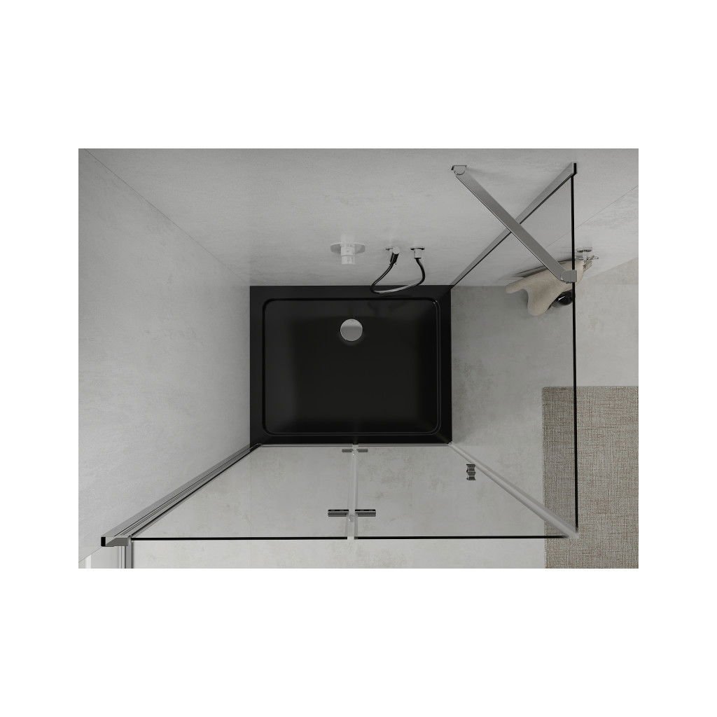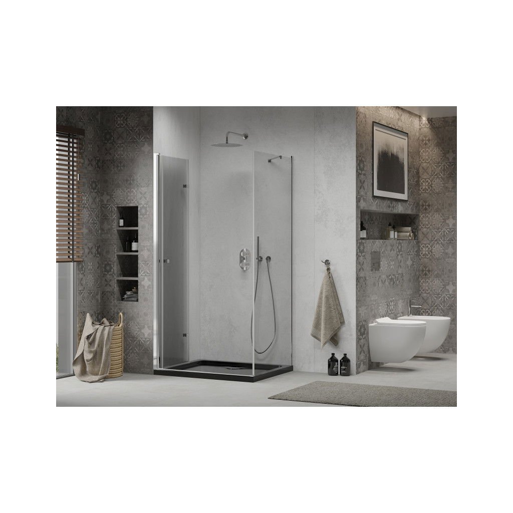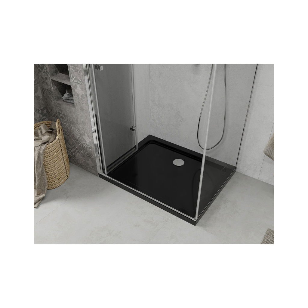 Mexen Lima, cabină de duș cu ușă rabatabilă 120 (uşă) x 90 (perete) cm, sticlă transparentă 6 mm, profil cromat + cadă de duș subțire neagră + sifon crom, 856-120-090-01-00-4070
