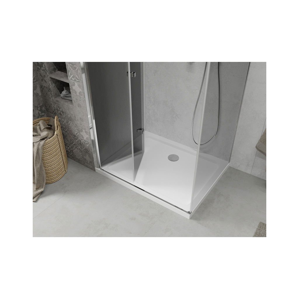 Mexen Lima, cabină de duș cu ușă rabatabilă 80 (uşă) x 90 (perete) cm, sticlă gri 6 mm, profil crom + cadă de duș albă subțire + sifon crom, 856-080-090-01-40-4010