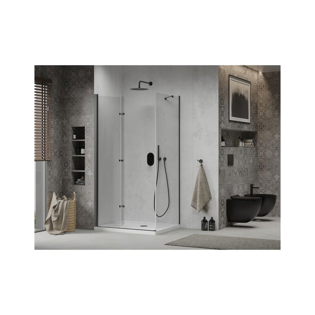 Mexen Lima, cabina de dus cu usa rabatabila 80 (usa) x 120 (perete) cm, sticla transparenta 6mm, profil negru + cadita de dus subtire alba cu sifon negru, 856-080-120-70-00-4010B
