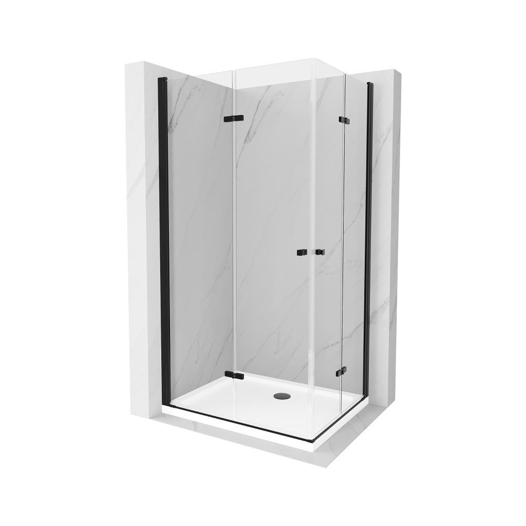 Mexen Lima Duo, cabină de duș cu ușă rabatabilă cu 2 canape 80 (uşă) x 70 (uşă) cm, sticlă transparentă 6 mm, profil negru + cadă de duș subțire 5 cm albă cu sifon negru, 856-080-070-70-02-4010B