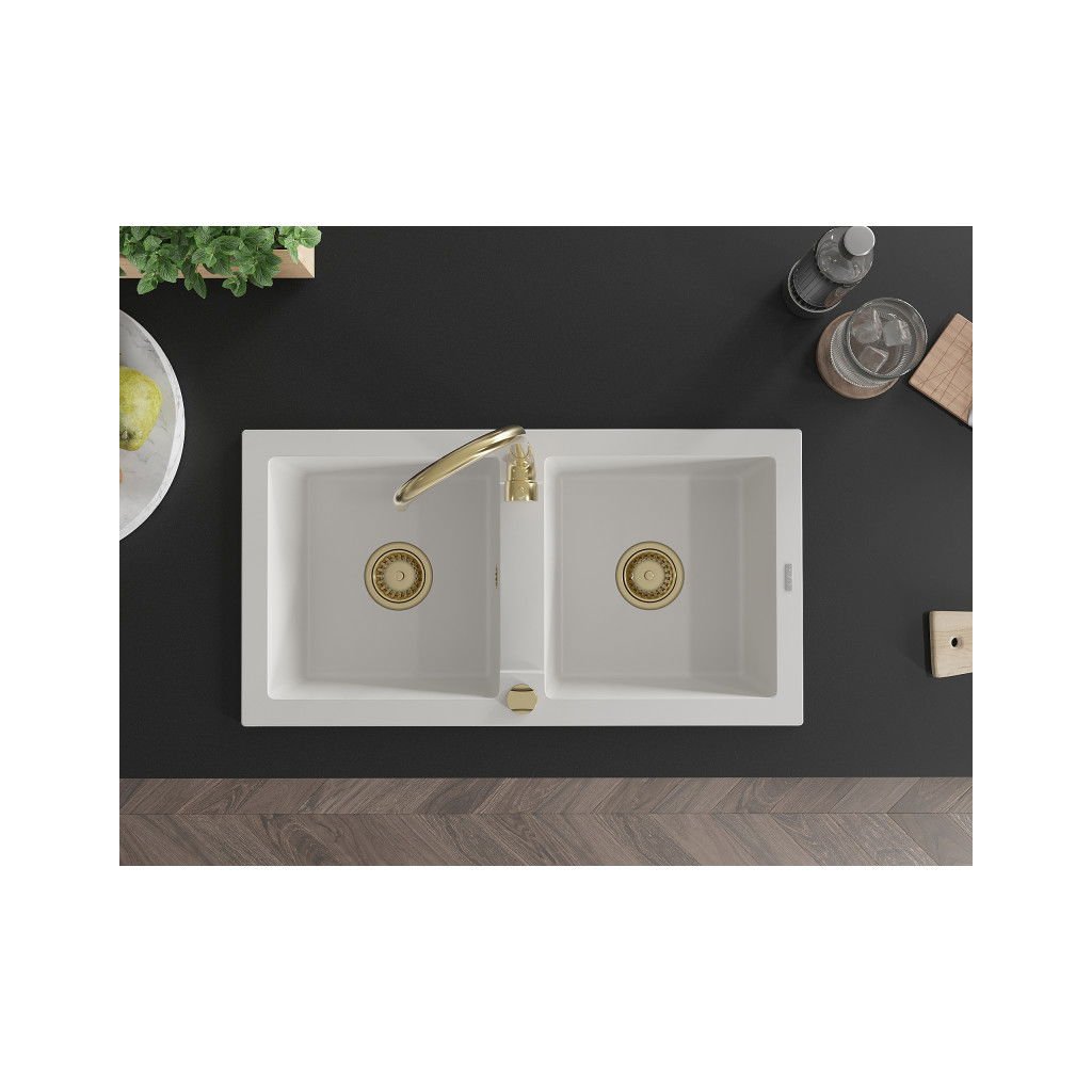 Mexen Mario, chiuveta granit 2 camere 82x44 cm cu robinet de bucatarie Telma, alb, 6504-20-670200-50