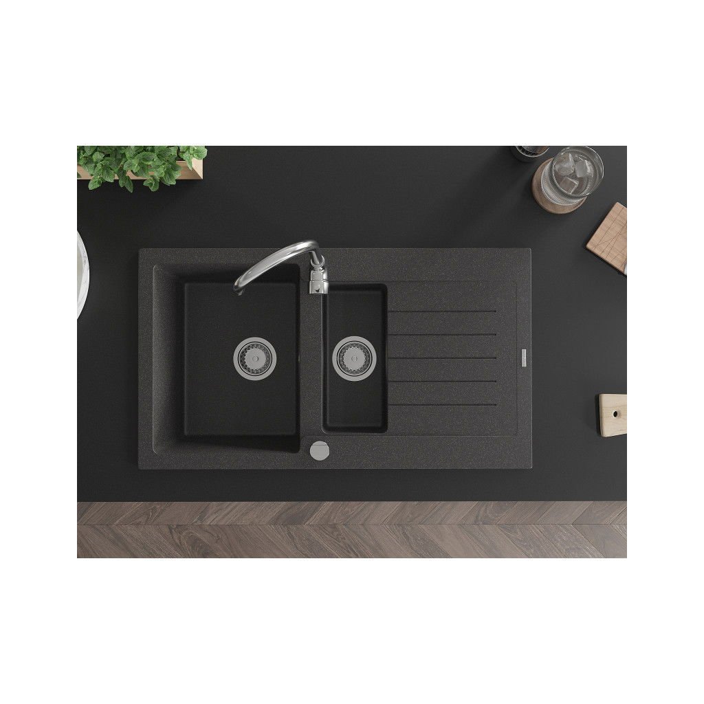 Mexen Matias, chiuveta granit 1,5 camere cu scurgere 90x50 cm si baterie bucatarie Telma, negru cu puncte argintii, 6502-76-670200-00