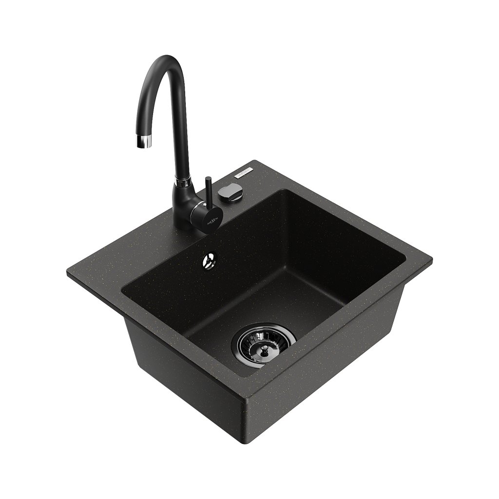 Mexen Milo, chiuvetă granit cu 1 cameră 435x410x171 mm și robinet Telma negru, negru-auriu metalic, 6505-75-670200-70-B