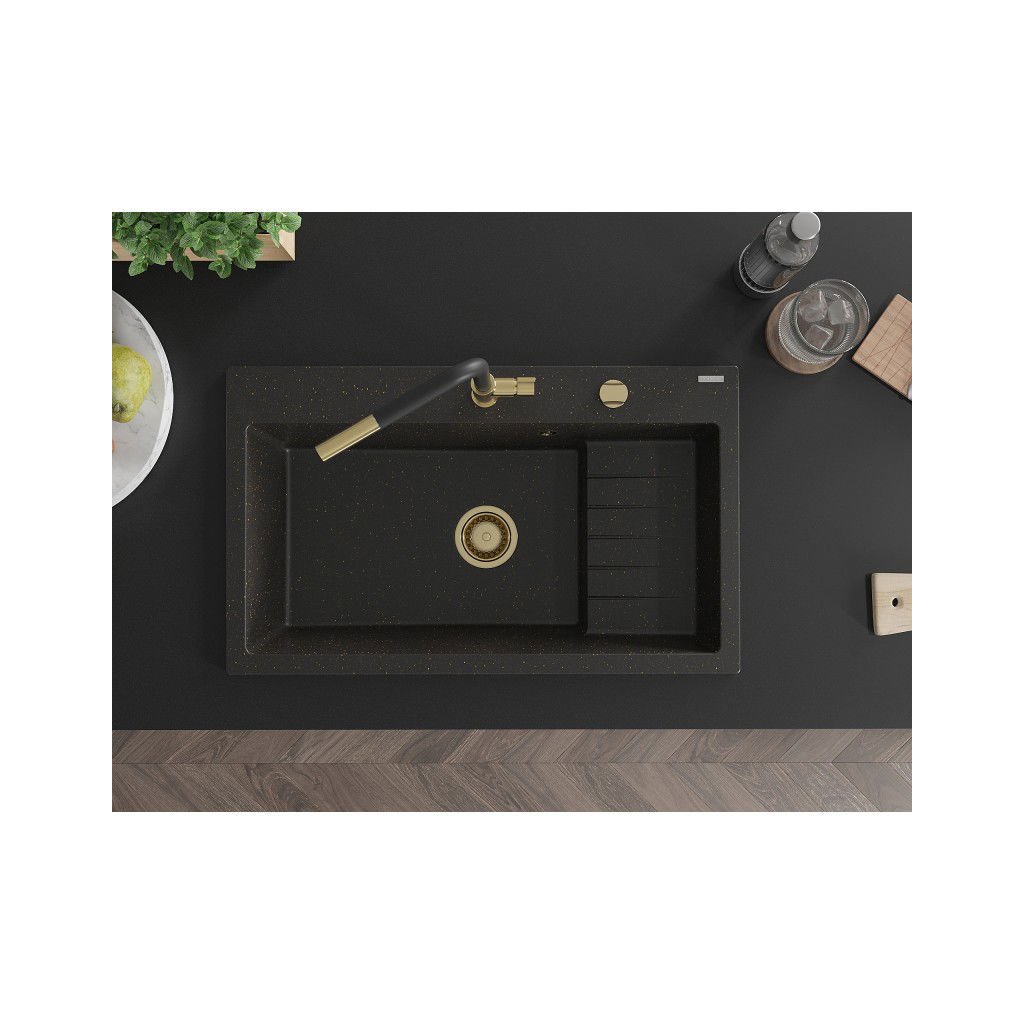 Mexen Omar, chiuveta granit cu 1 camera 800x480x210 mm, negru-auriu metalic, sifon auriu, 6520801005-75-G
