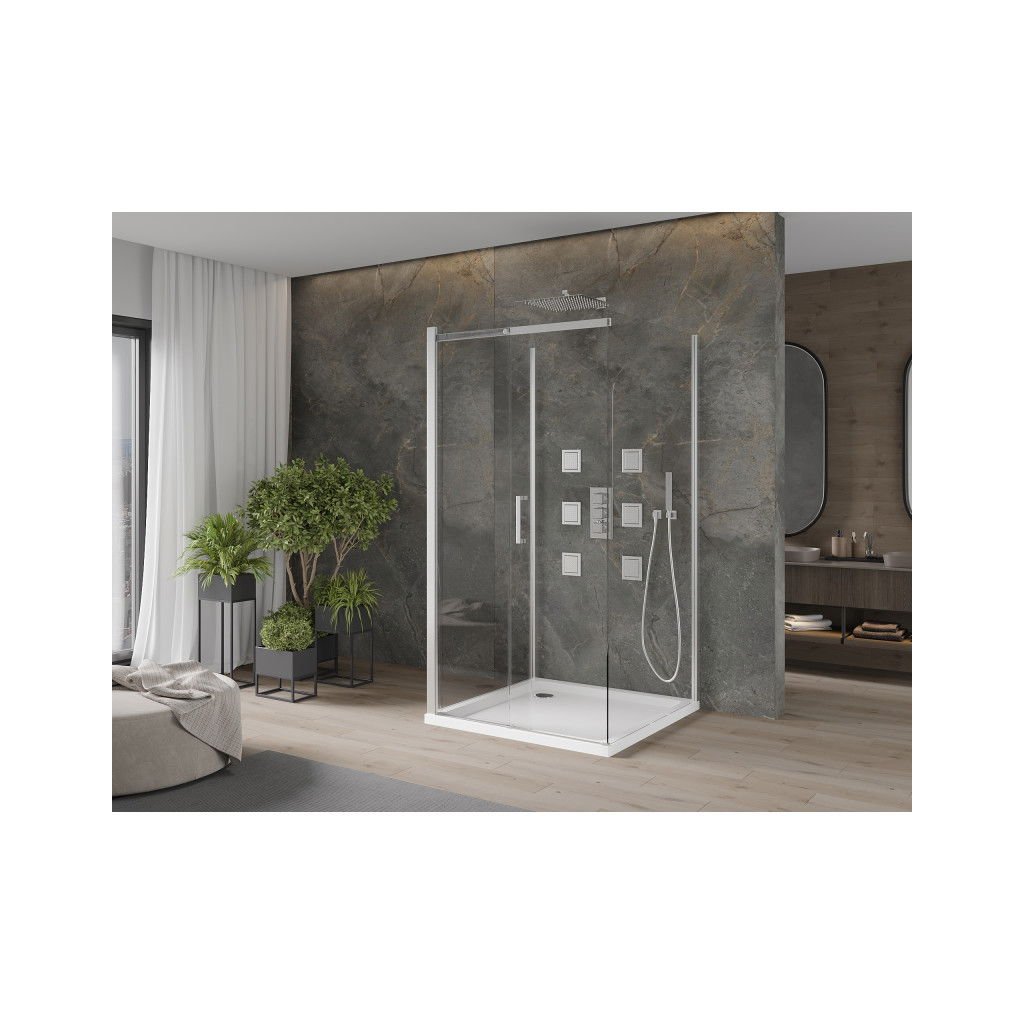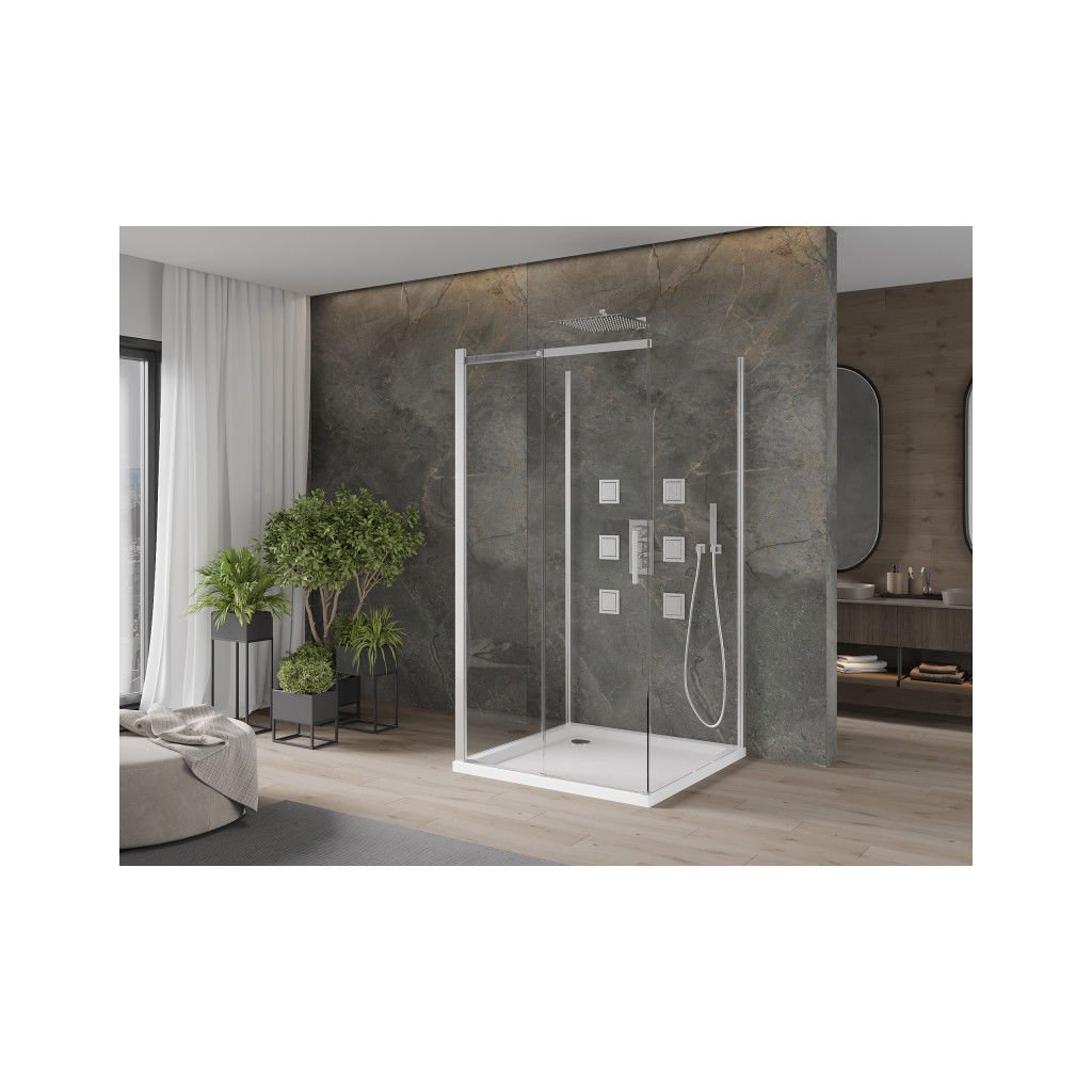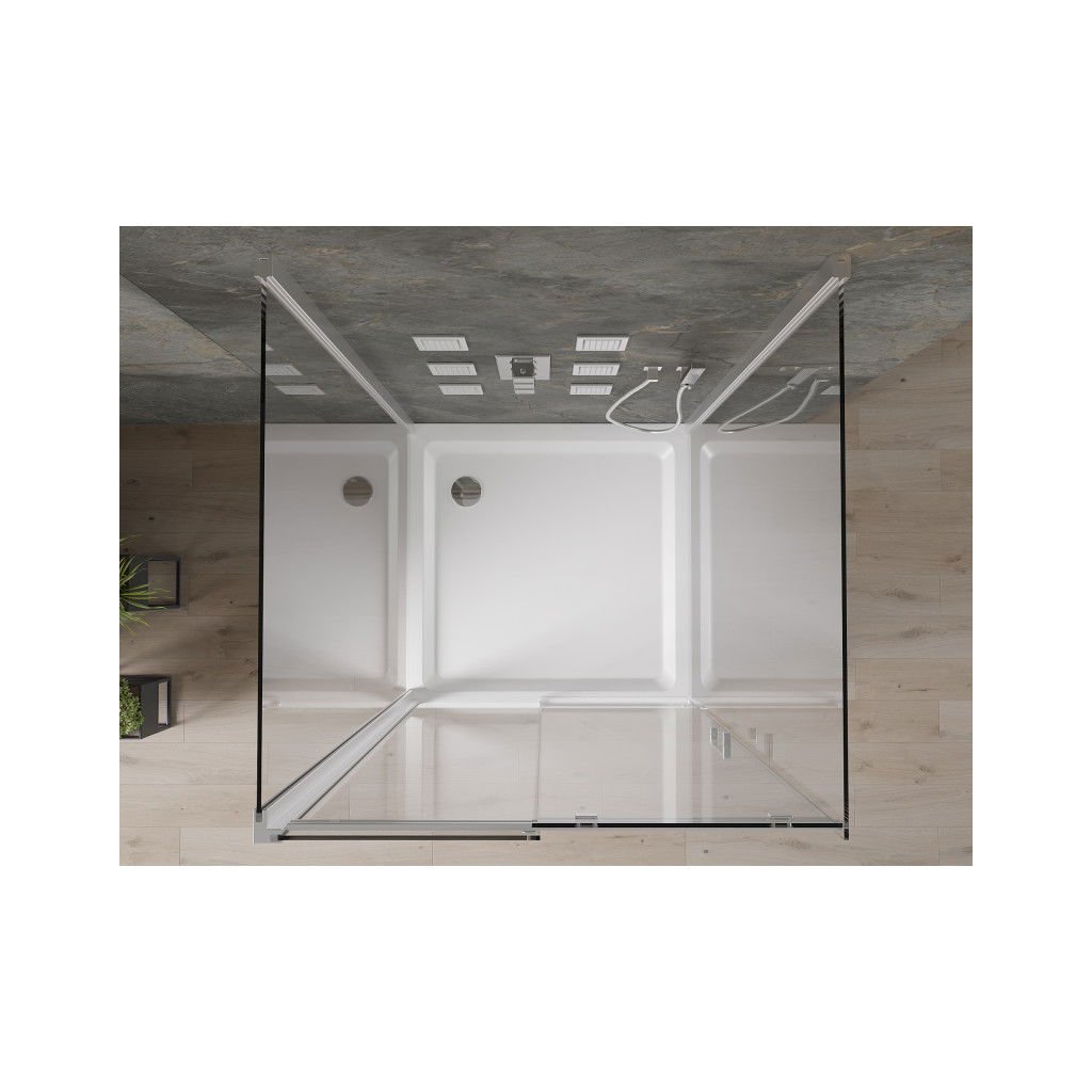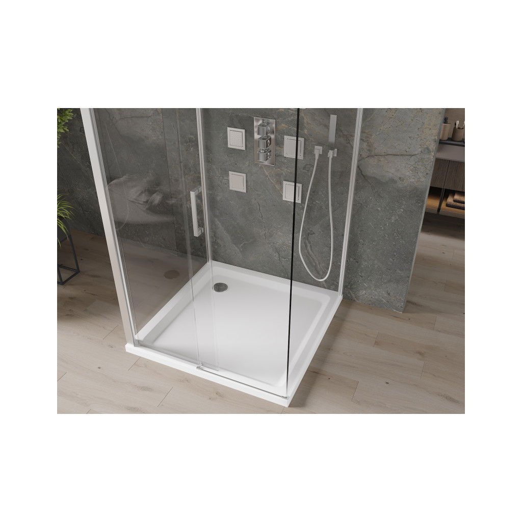 Mexen Omega, cabină de duș cu 3 pereți cu ușă glisantă 100 (uşă) x 100 (perete) x 190 cm, sticlă transparentă de 8 mm, profil crom + cadă de duș SLIM albă, 825-100-100-01-00-3s-4010