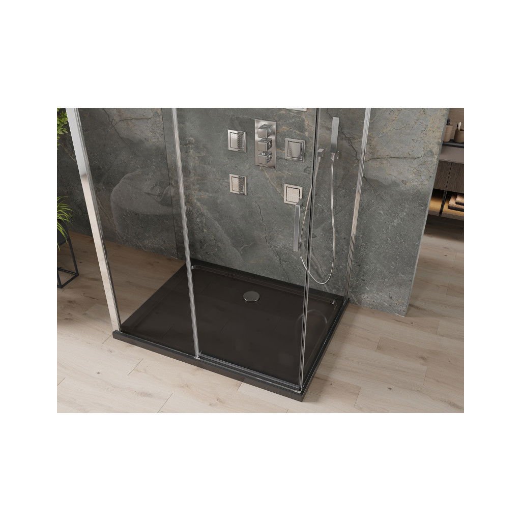 Mexen Omega, cabină de duș cu 3 pereți cu ușă glisantă 140 (uşă) x 100 (perete) x 190 cm, sticlă transparentă de 8 mm, profil crom + cadă de duș SLIM neagră, 825-140-100-01-00-3S-4070