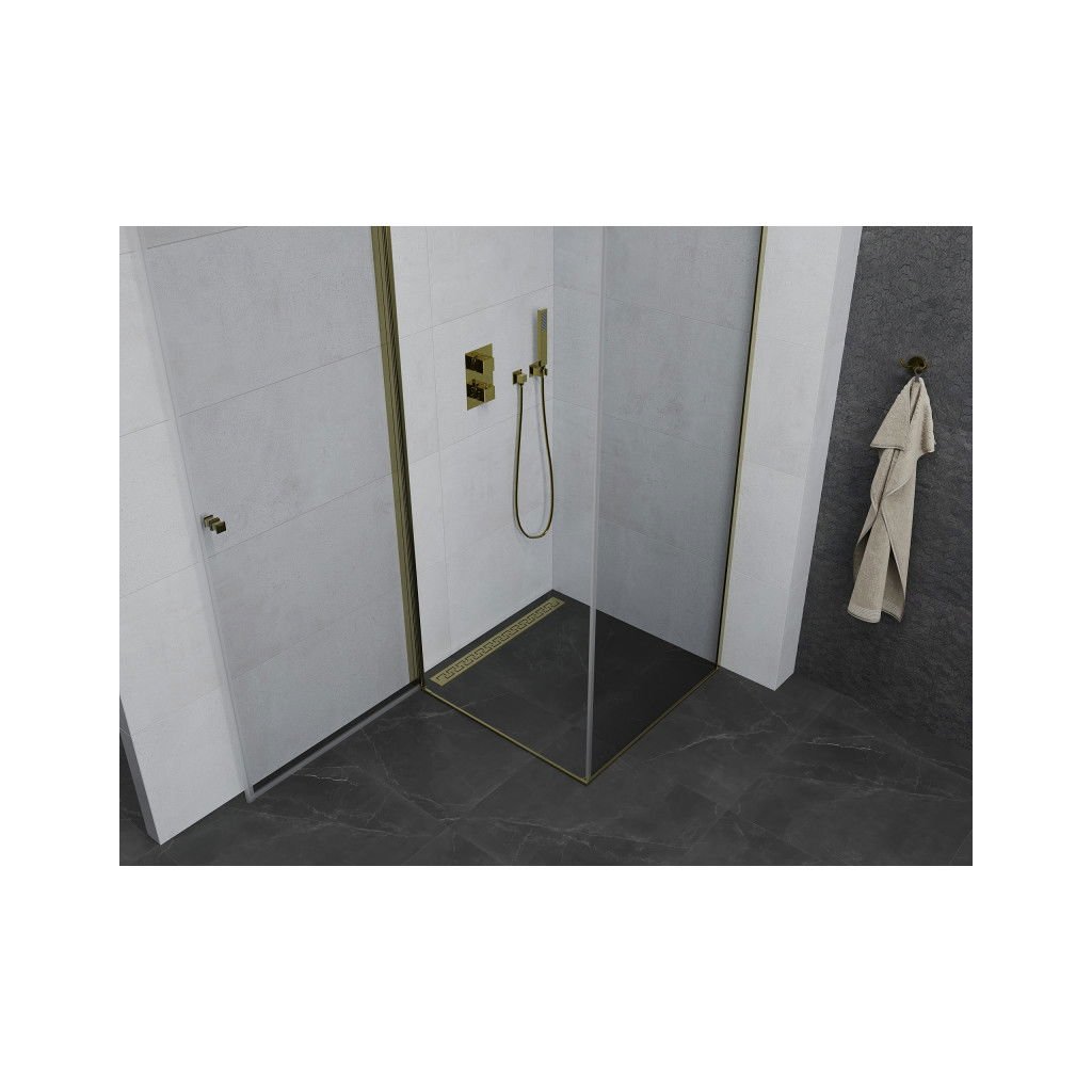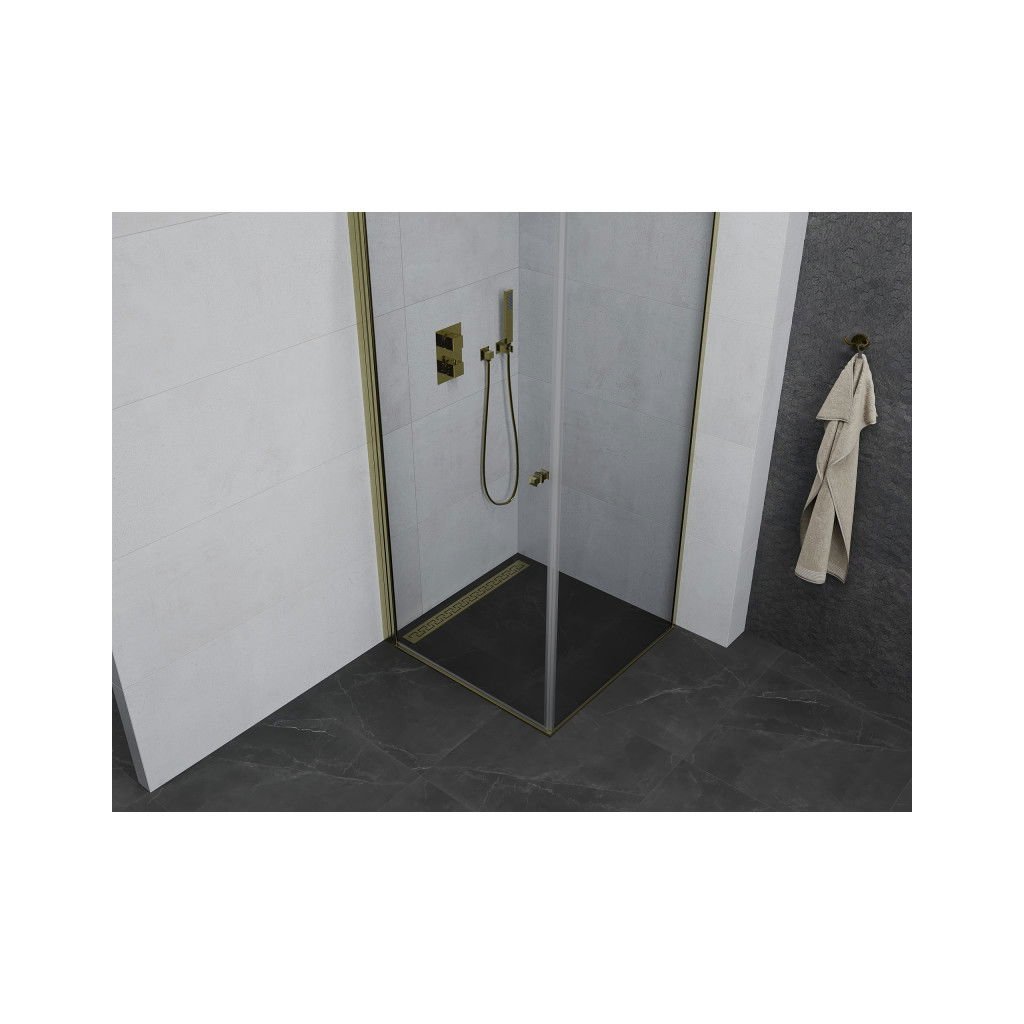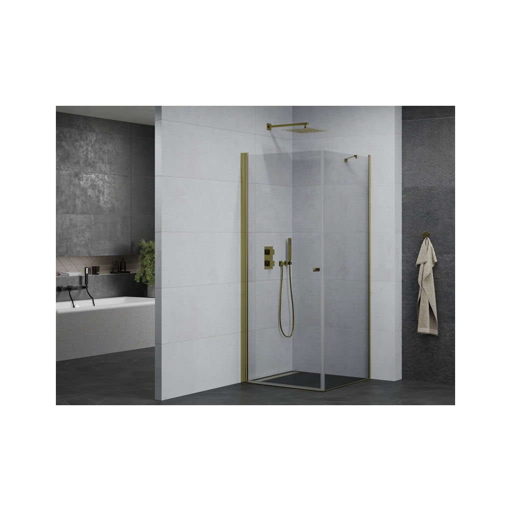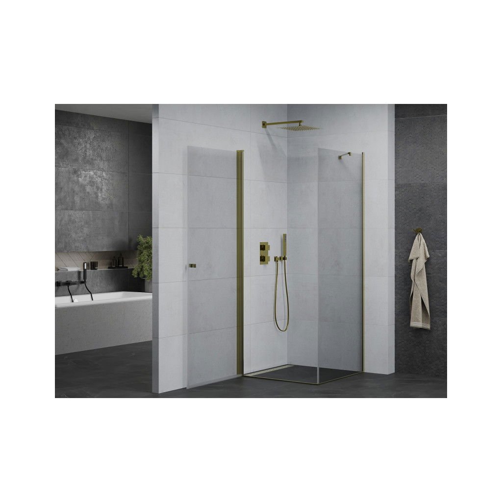 O alegere excelentă pentru orice baie. Cabina de dus eleganta este realizata din sticla securizata de 6 mm grosime in trecerea procedurii. Tratamentul de suprafață de sticlă Easy Clean aplicat asigură confort maxim tuturor utilizatorilor. Această tehnologie garantează proprietăți unice pentru a preveni contaminarea sticlei - suprafața este doar clătită cu apă. Coltarul este prevazut cu profile din aluminiu auriu si este prevazut cu o garnitura care previne scurgerea apei in afara coltului de dus. Ușa dușului este rabatabilă și poate fi deschisă spre interior sau spre exterior (trebuie selectată în timpul asamblarii). Pentru deschidere se folosește un mâner metalic discret. Stabilitatea perfectă a colțului de duș este asigurată de brațul de stabilizare, care face parte din produs.