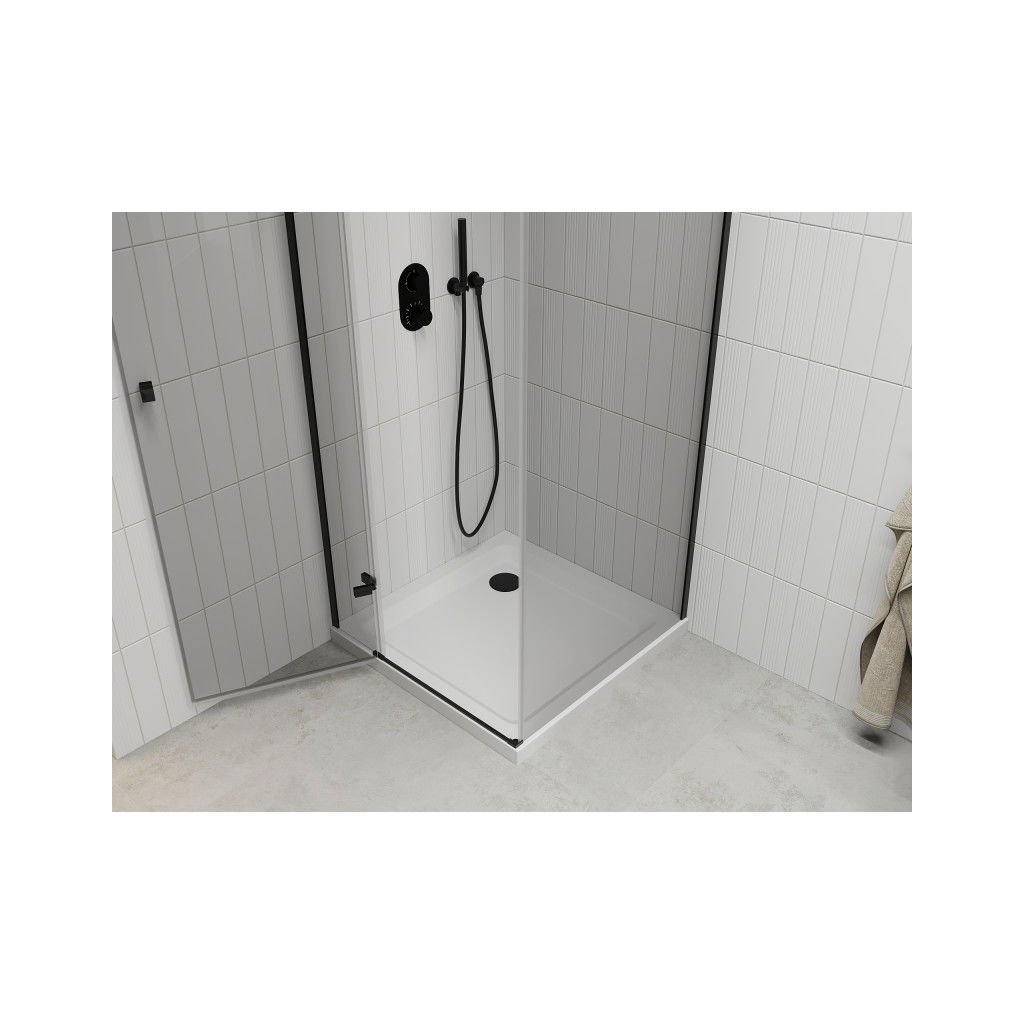 Mexen Roma, cabină de duș cu ușă 1 canat 100 (uşă) x 100 (perete) cm, sticlă transparentă 6 mm, profil negru, cadă de duș subțire 5 cm albă cu sifon negru, 854-100-100-70-00-4010B