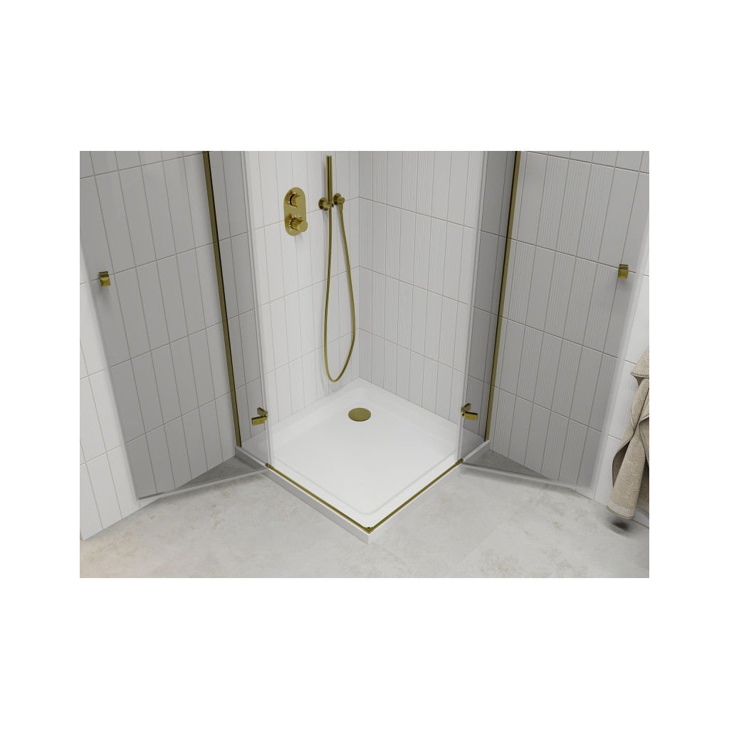 Mexen Roma Duo, cabină de duș 80 (uşă) x 80 (uşă) cm, sticlă transparentă 6mm, profil auriu + cadă de duș SLIM 5cm alb + sifon auriu, 854-080-080-50-02-4010G
