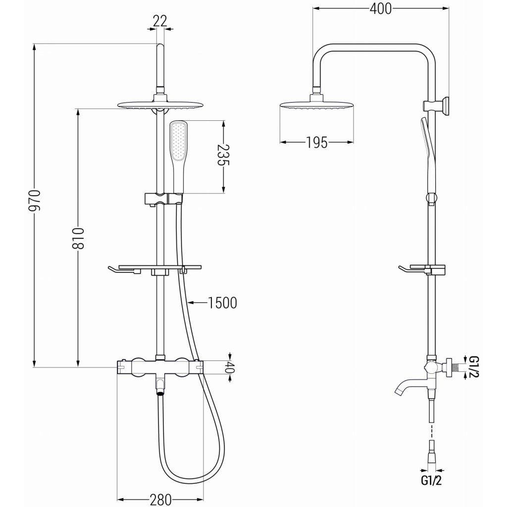 - Conexiuni: 1/2" (jos - duș de mână) + 3/4" (sus pentru coloana de duș)