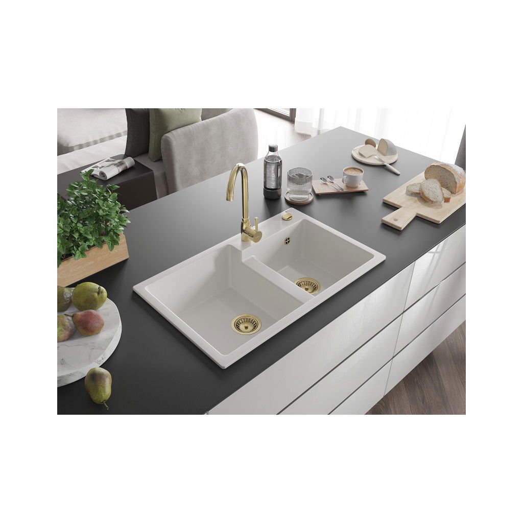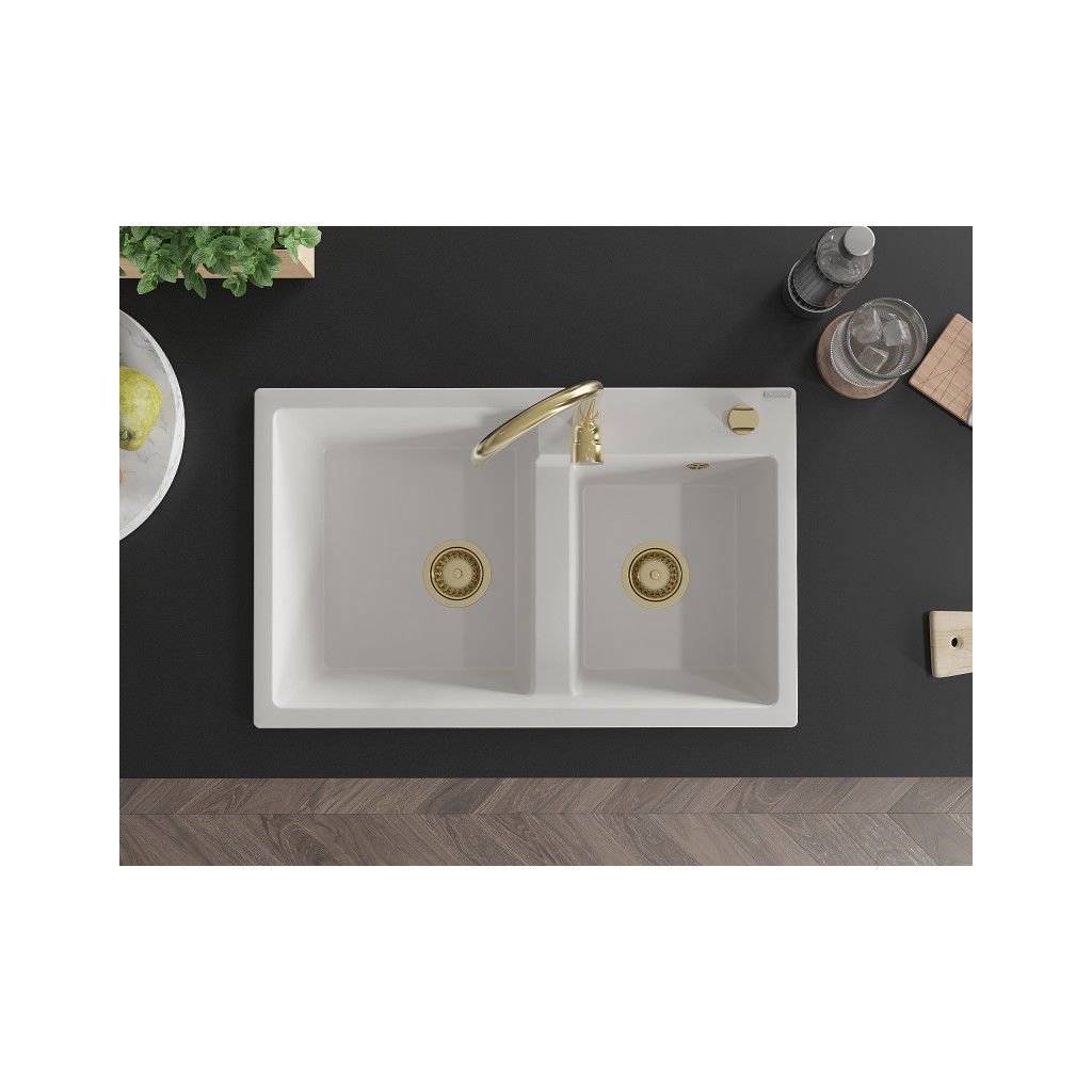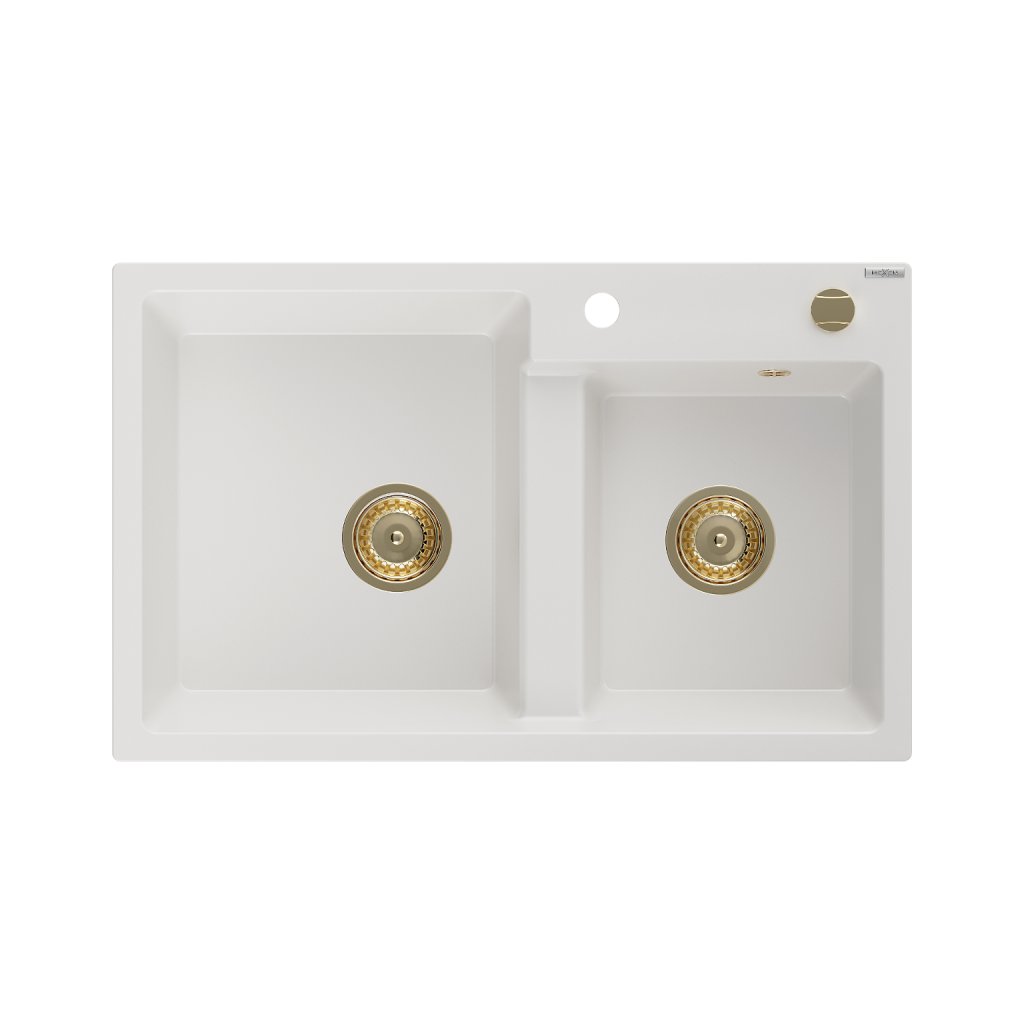Mexen Tomas, chiuveta granit 800x500x190 mm, 2 camere, alb cu sifon auriu, 6516802000-20-G