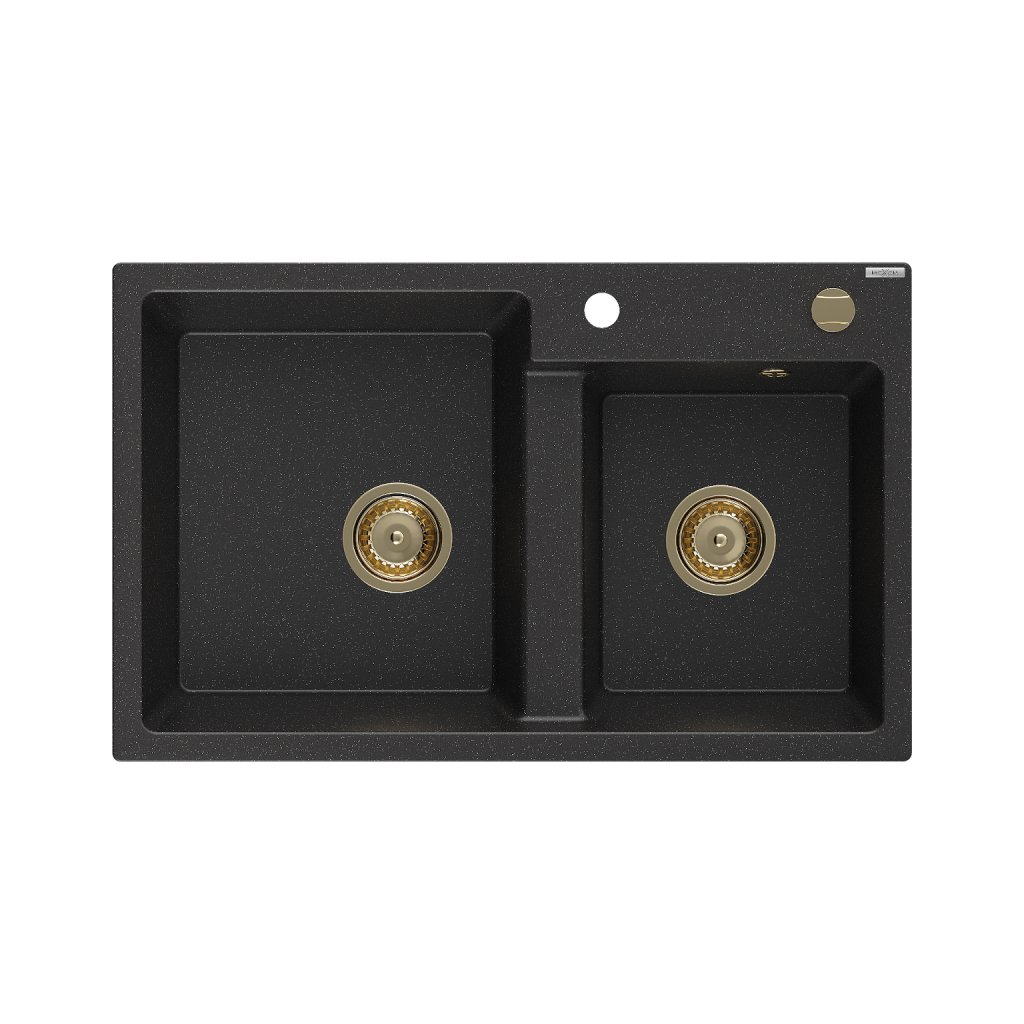 Mexen Tomas, chiuveta granit 800x500x190 mm, 2 camere, negru-argintiu metalic cu sifon auriu, 6516802000-73-G