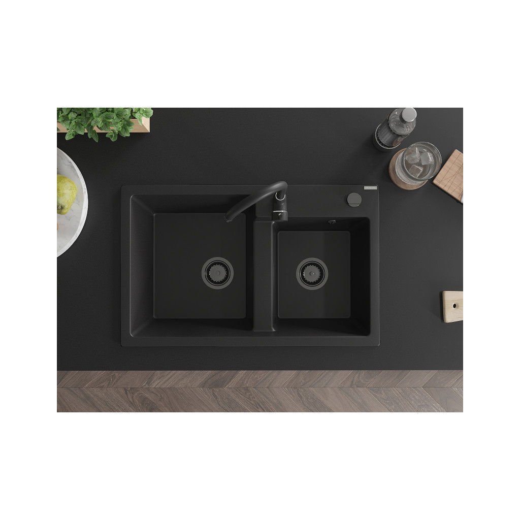 Mexen Tomas, chiuveta granit 800x500x190 mm, 2 camere, negru cu sifon negru, 6516802000-77-B