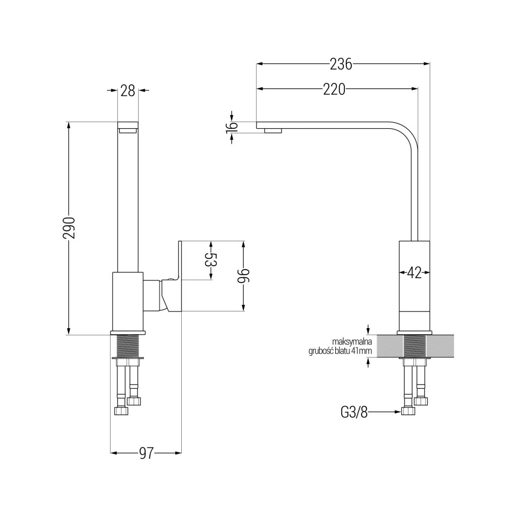 - Numar de gauri: 2 (1 pentru robinetul de bucătărie + 1 pentru controlul automat al dopului de scurgere)