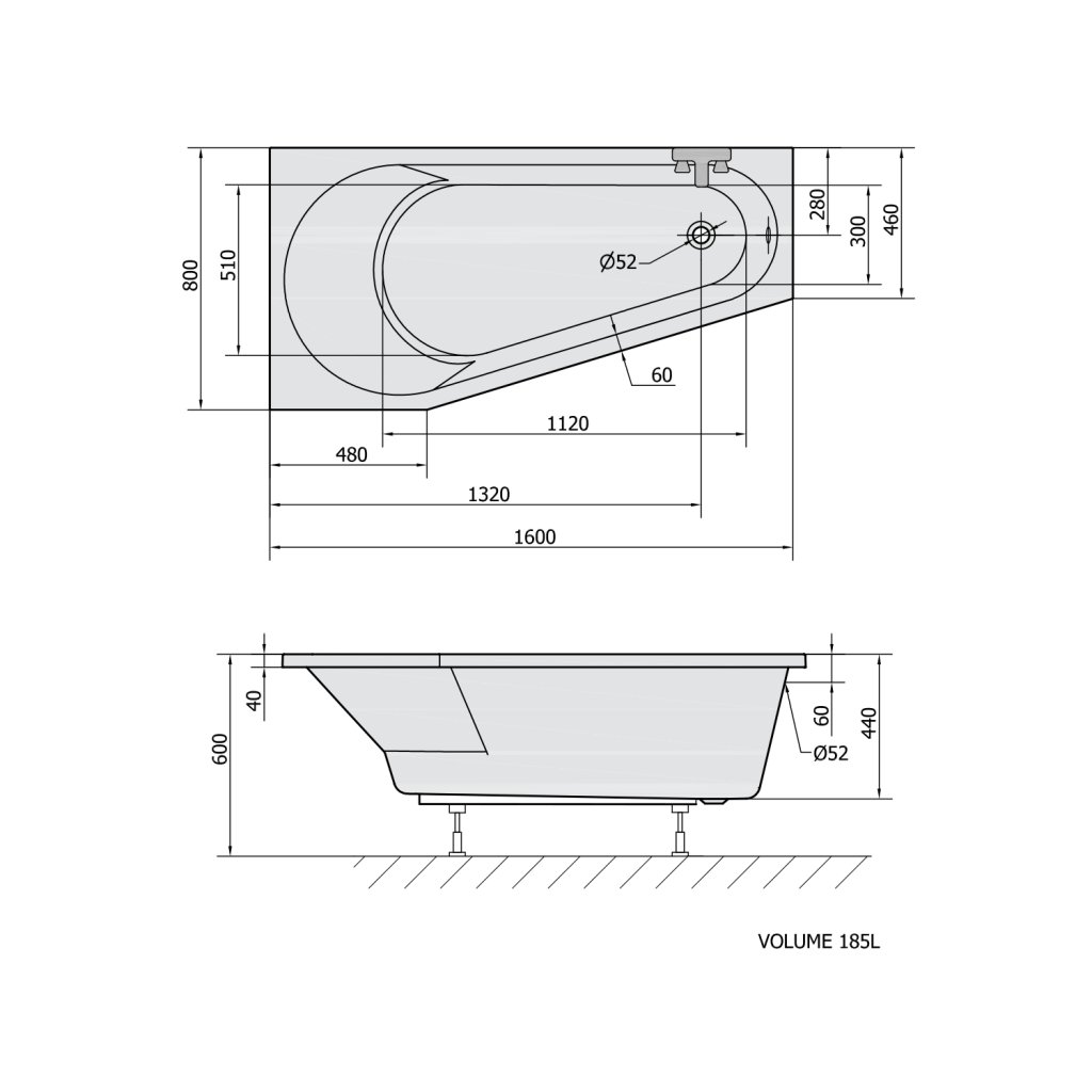 Polysan, cada asimetrică PROJEKTA L 160x80x44cm, alb, 20111