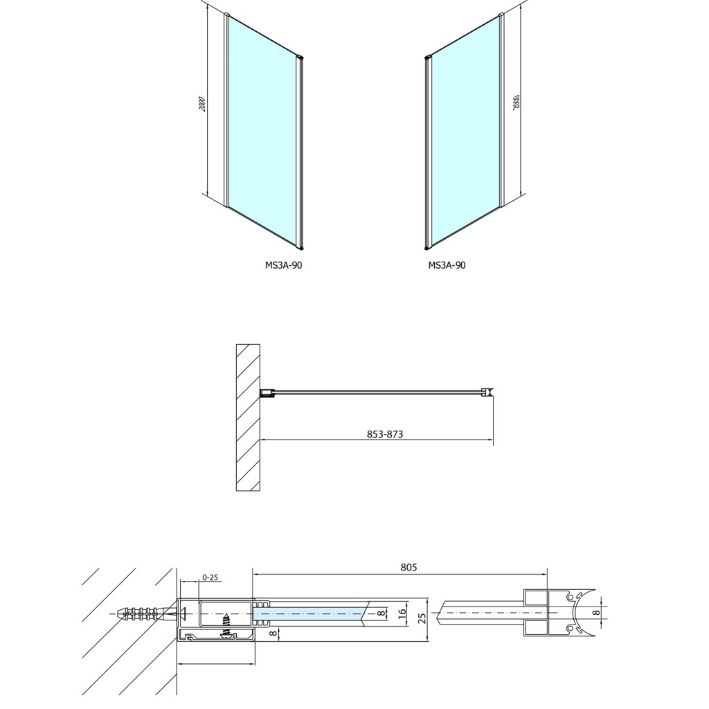 - Este un perete fix din sticla transparenta cu profil de perete cu reglaj de 0-30 mm pentru montare pe perete