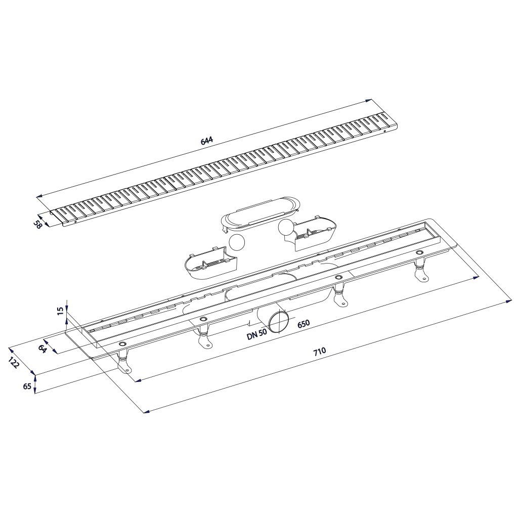 Polysan, scurgere de podea KLAVER cu grătar din oțel inoxidabil, L-710, DN50, mat negru, 73721B
