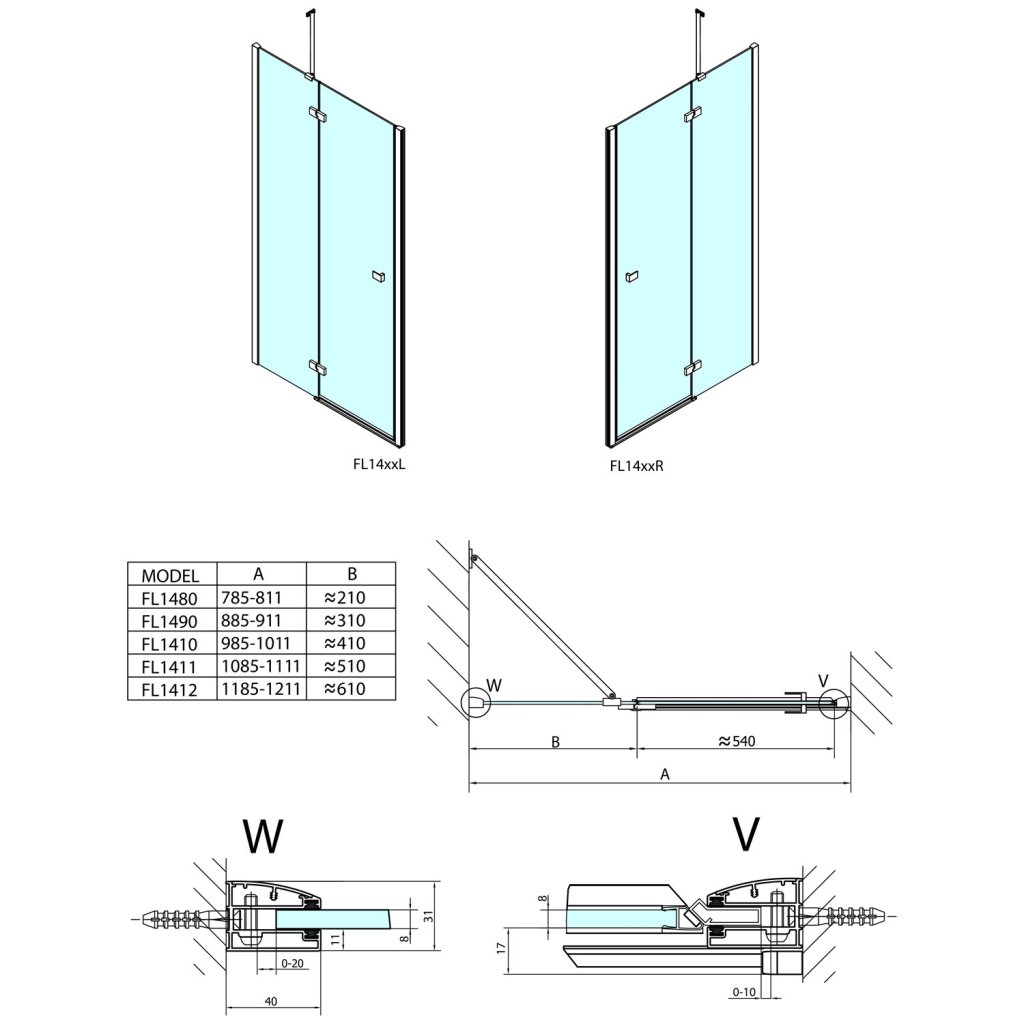 Ecrane cu balamale fără cadru FORTIS LINE într-un design unghiular modern. Balamale cromate minimaliste cu un design unghiular fără compromisuri, încastrate din interior pentru o curățare ușoară și cu funcție de ridicare pentru deschidere convenabilă. Sticla transparentă de siguranță cu o grosime de 8 mm este tratată cu tratament de suprafață ANTIDROP pentru o curățare ușoară. Inaltime 2000 mm. Mâner pătrat cromat în același design minimalist ca și balamalele.