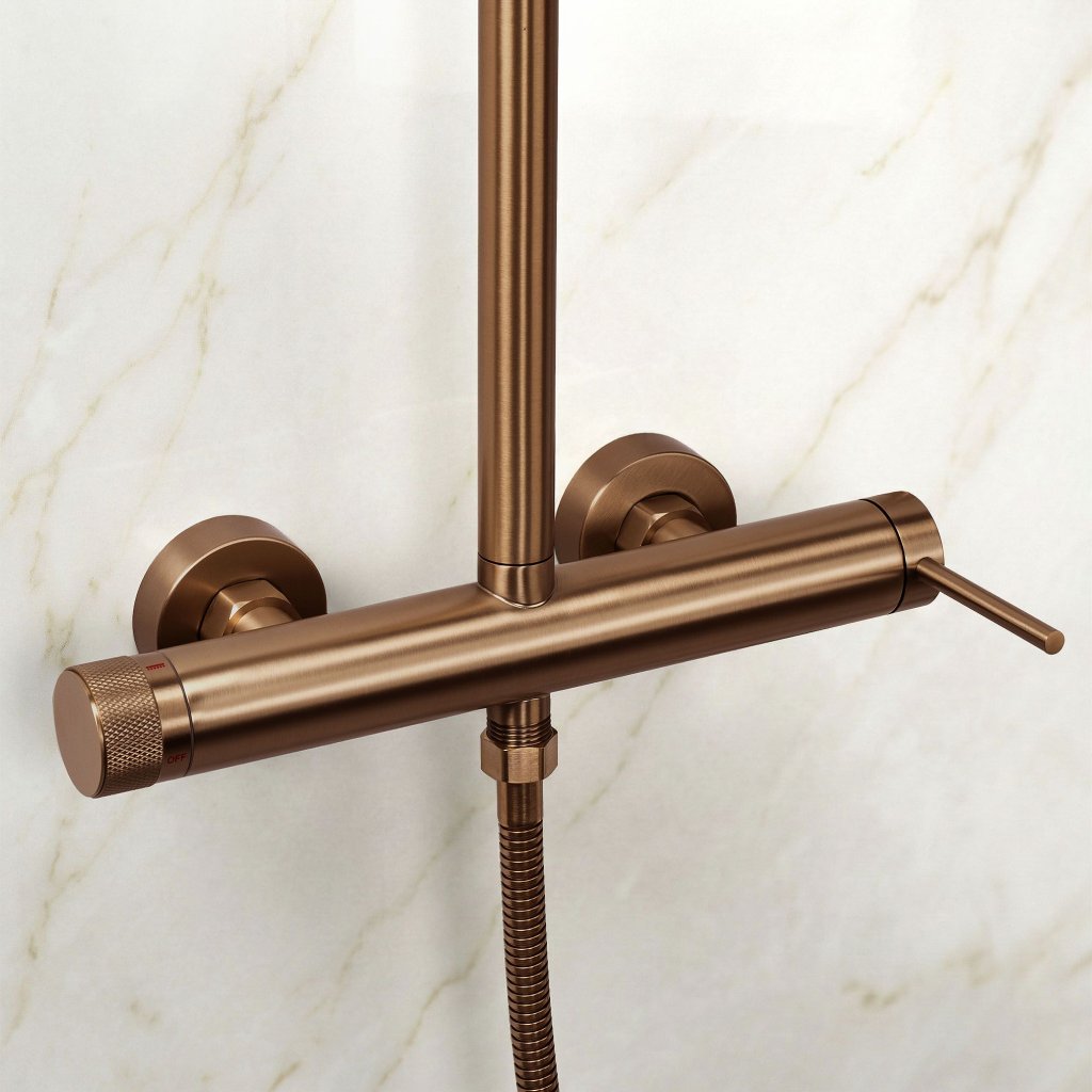 Elegantul set de duș din cupru periat este o alegere excelentă pentru băile unde designul și fiabilitatea sunt importante. Nuanța caldă de cupru conferă interiorului un aspect unic, iar stratul durabil PVD protejează eficient împotriva zgârieturilor, pătării și decolorării. Corpul din alamă masivă și soluțiile funcționale garantează confortul utilizării zilnice.