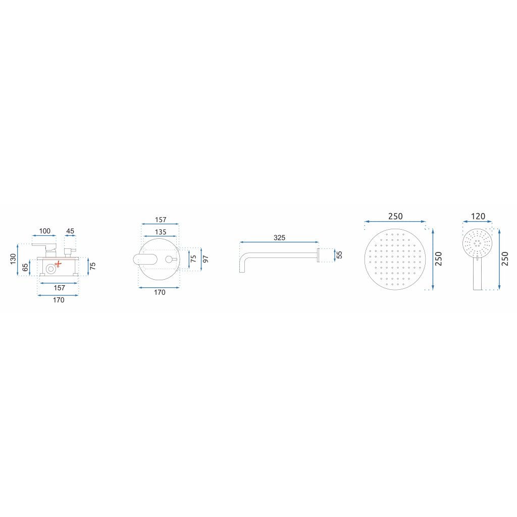 - Cap de duș cu ploaie: 250x250 mm